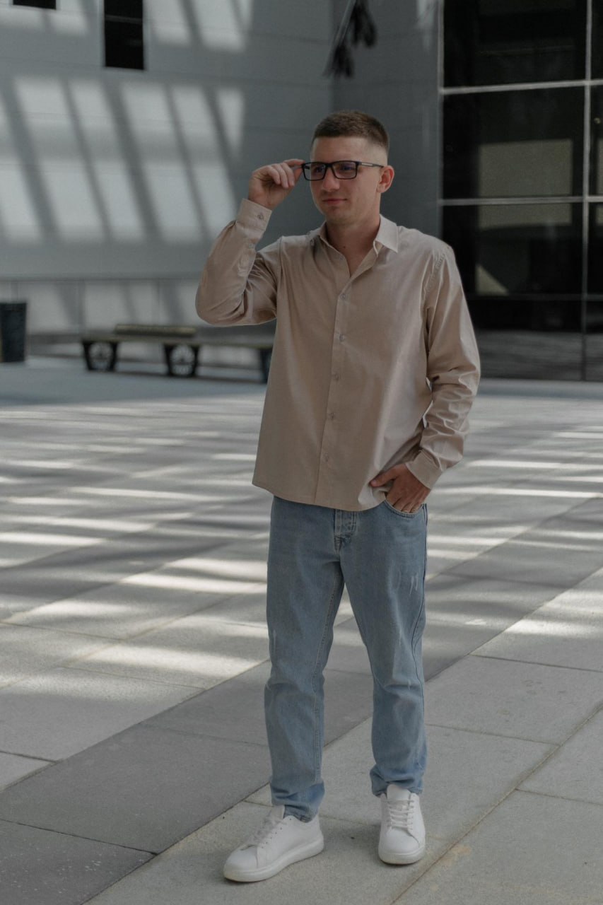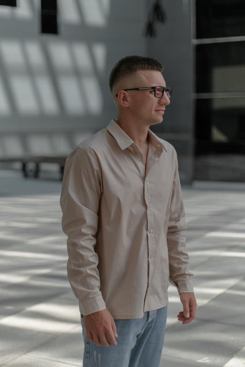 Чоловіча Класична Бавовняна Бежева Сорочка Вільного Прямого Крою