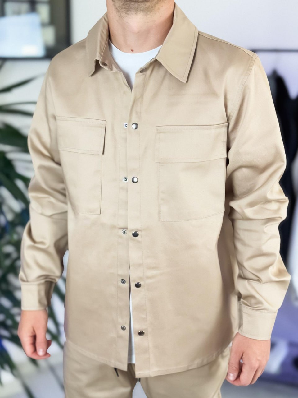 Чоловіча Щільна Бавовняна Бежева Сорочка – Базова на Кнопках з Накладними Кишенями
