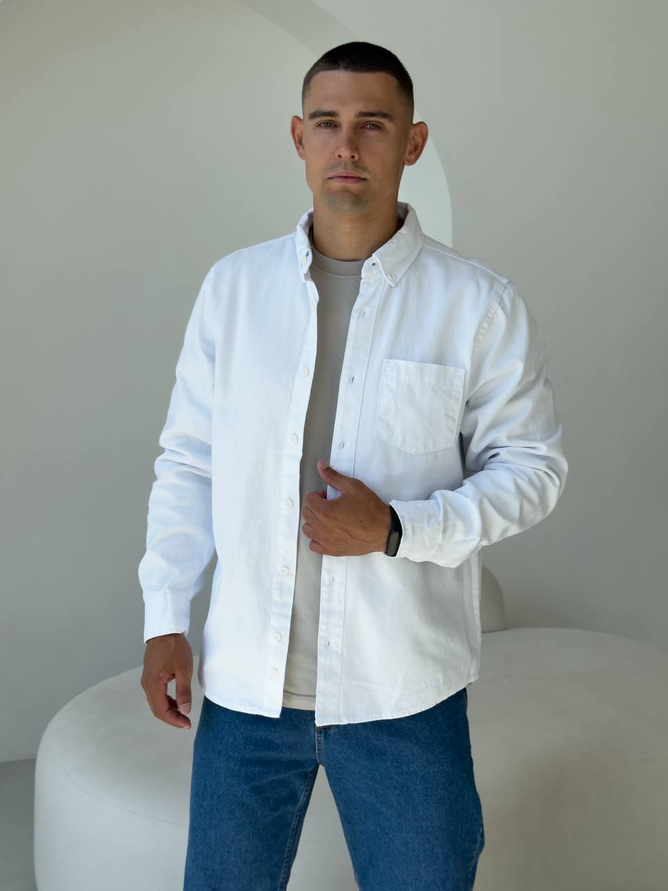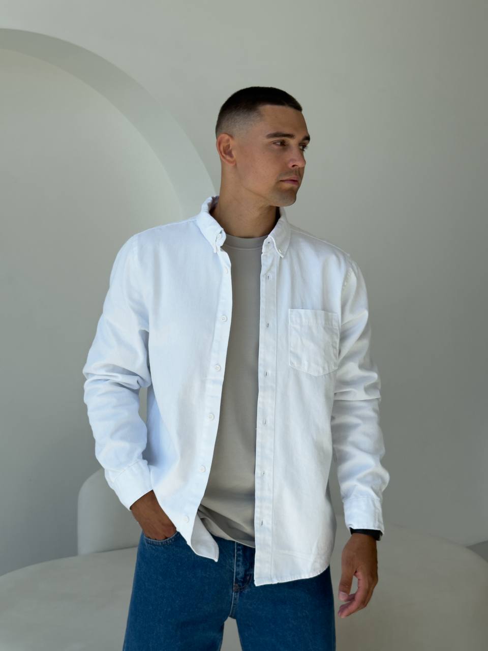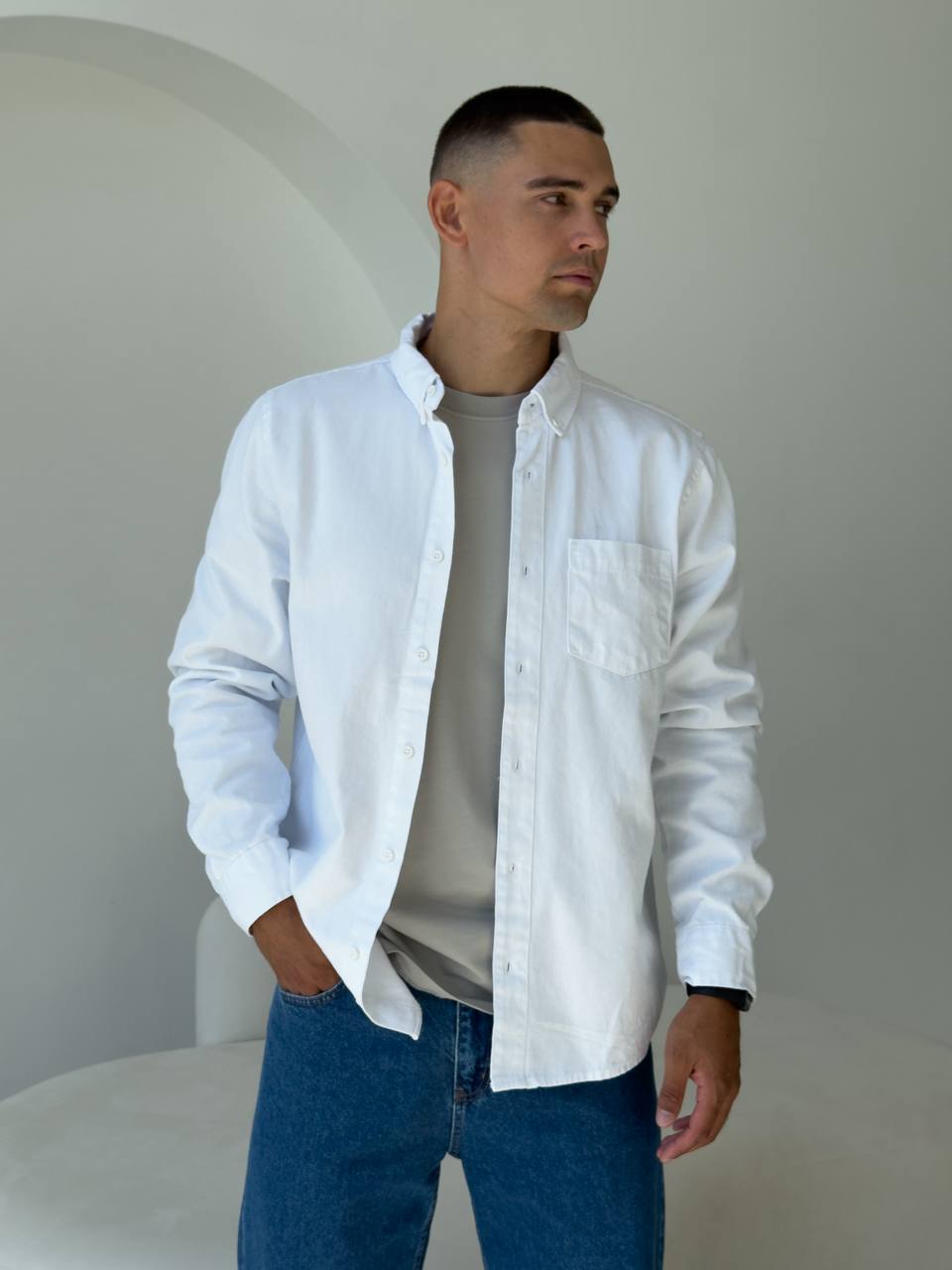 Чоловіча Щільна Бавовняна Біла Сорочка Прямого Крою з Кишенею на Грудях