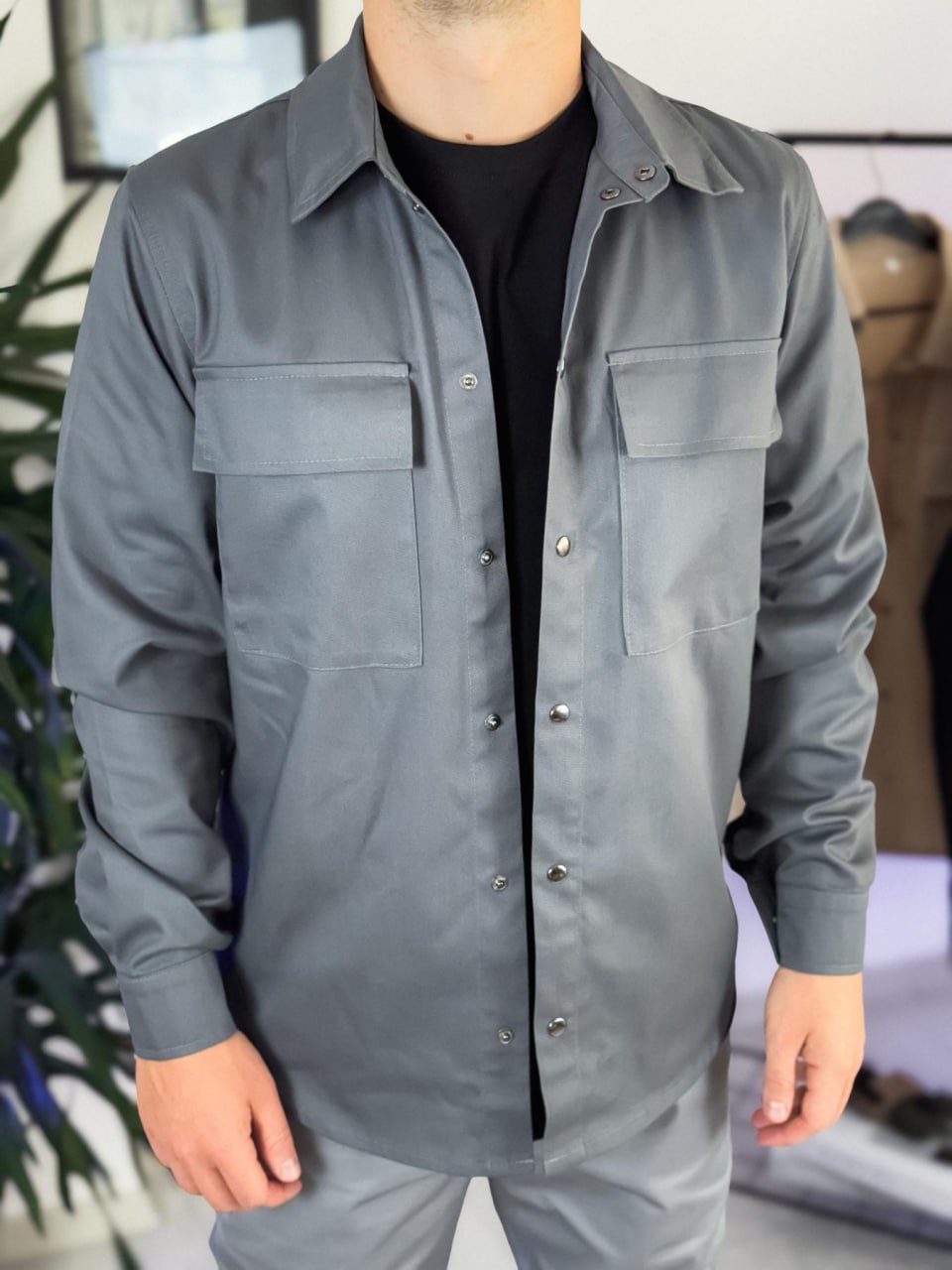 Чоловіча Щільна Бавовняна Сіра Сорочка – Базова на Кнопках з Накладними Кишенями