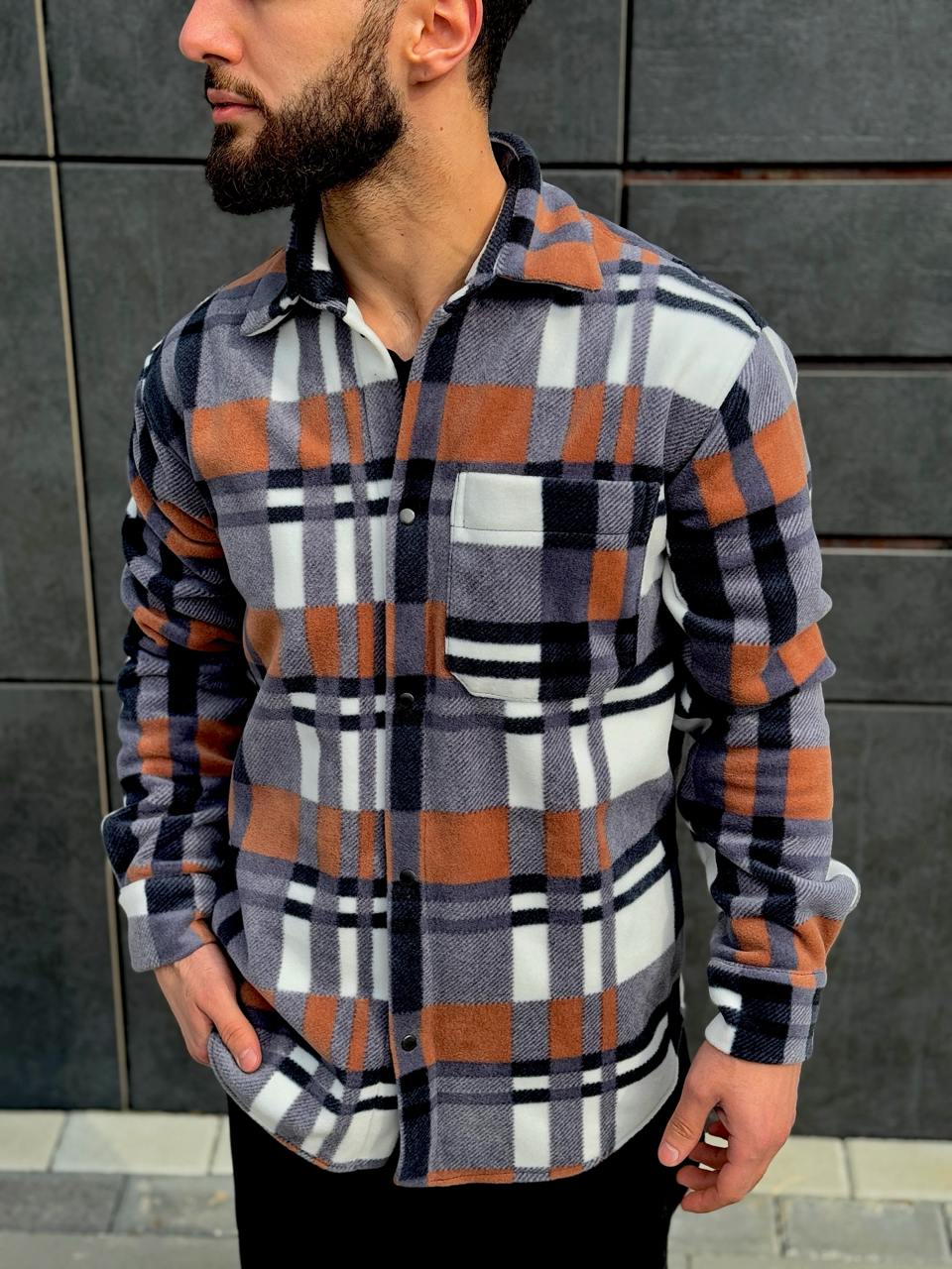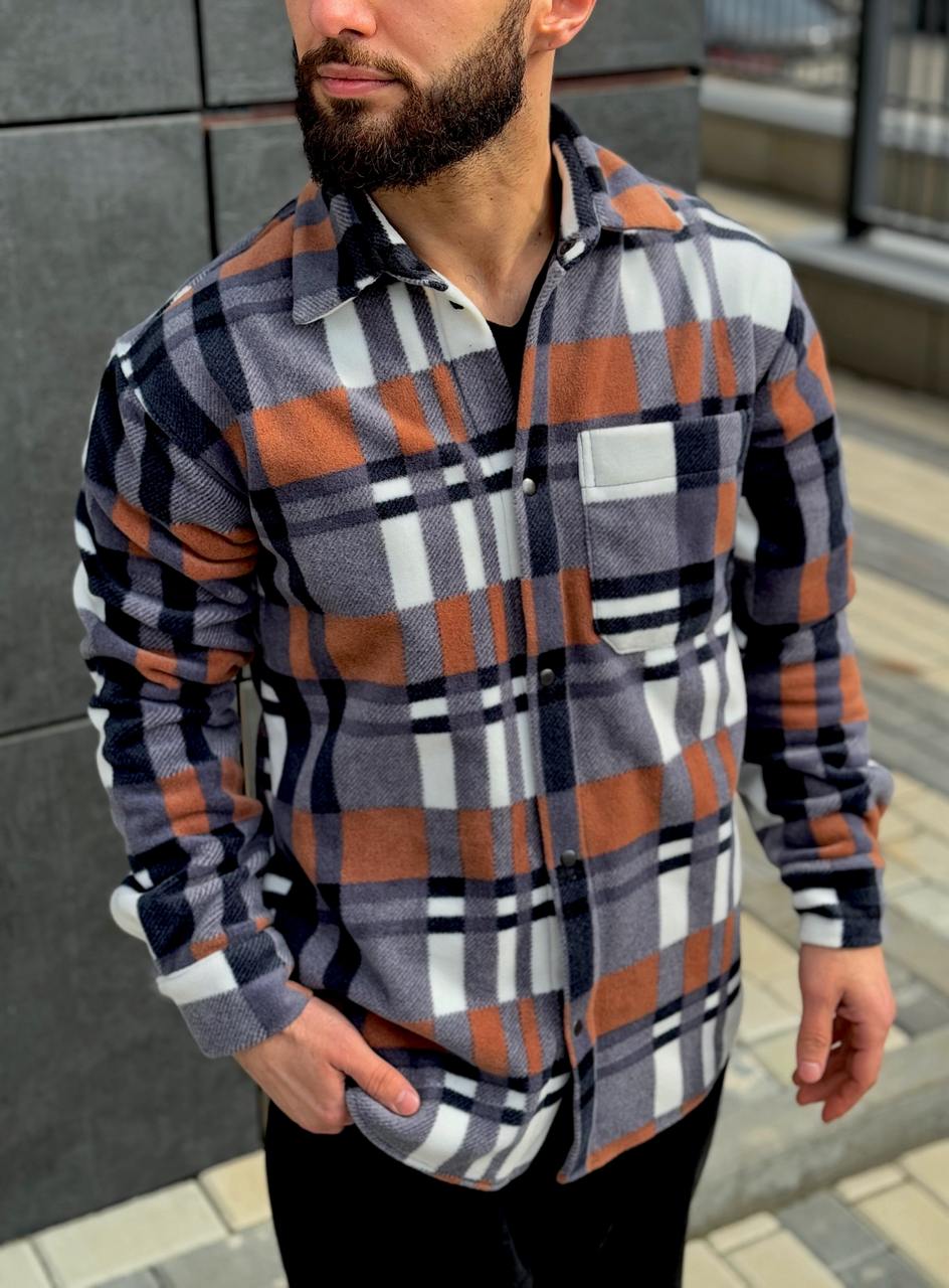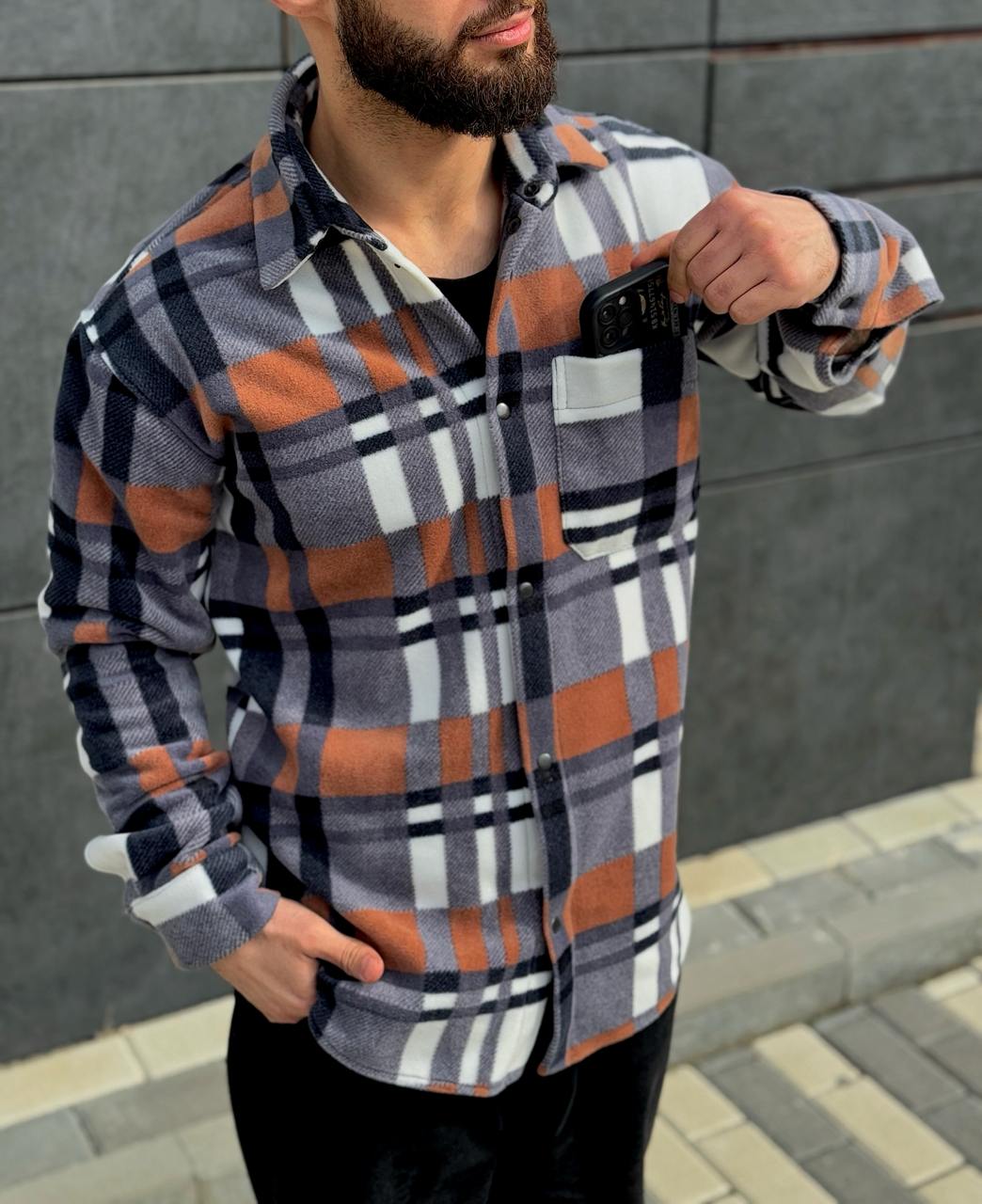 Чоловіча Тепла Флісова Сіра Сорочка Вільного Крою в Клітинку