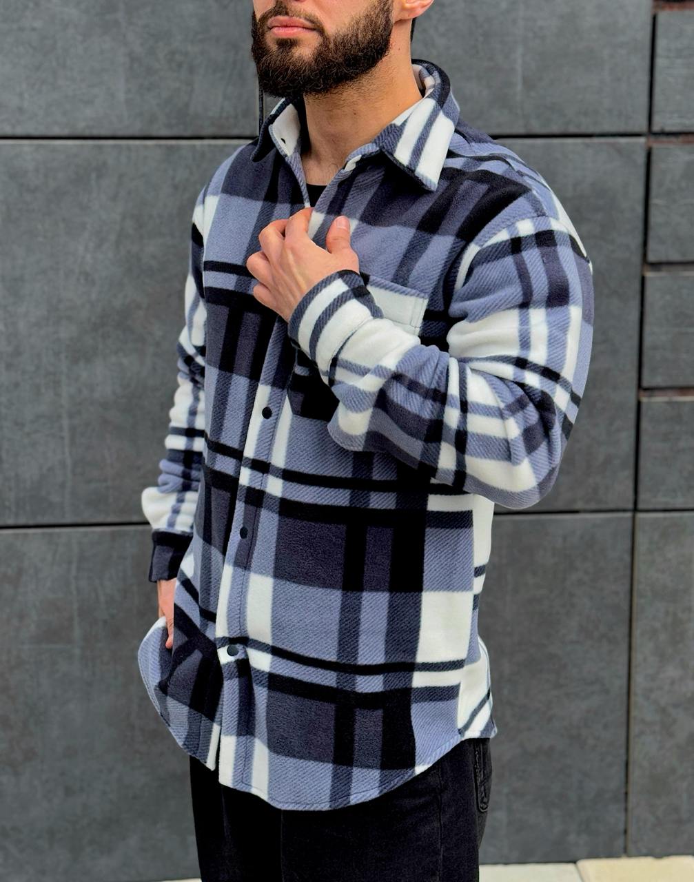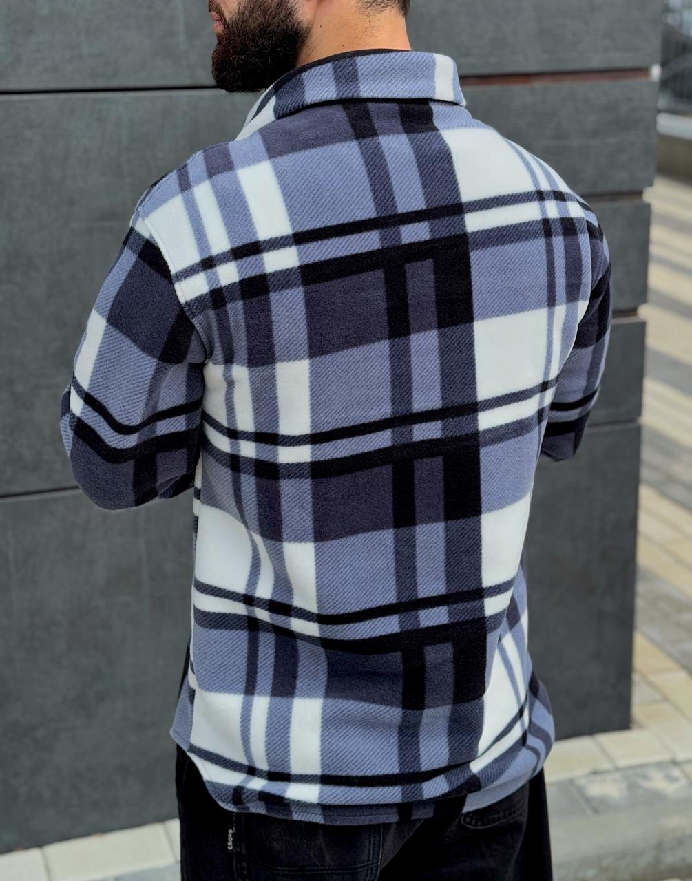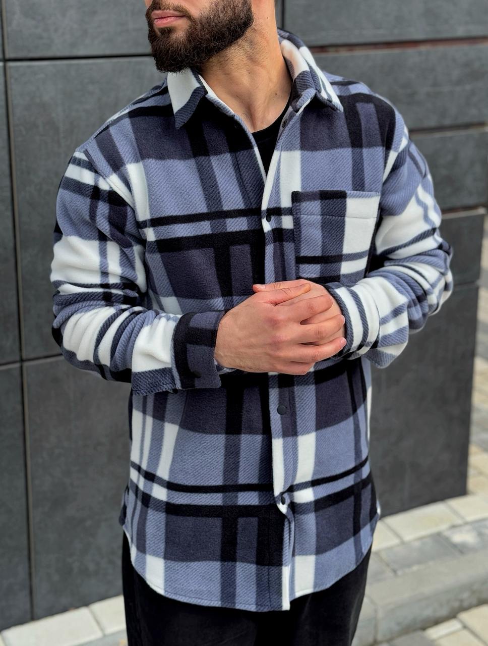 Чоловіча Тепла Флісова Синя Сорочка Вільного Крою в Клітинку