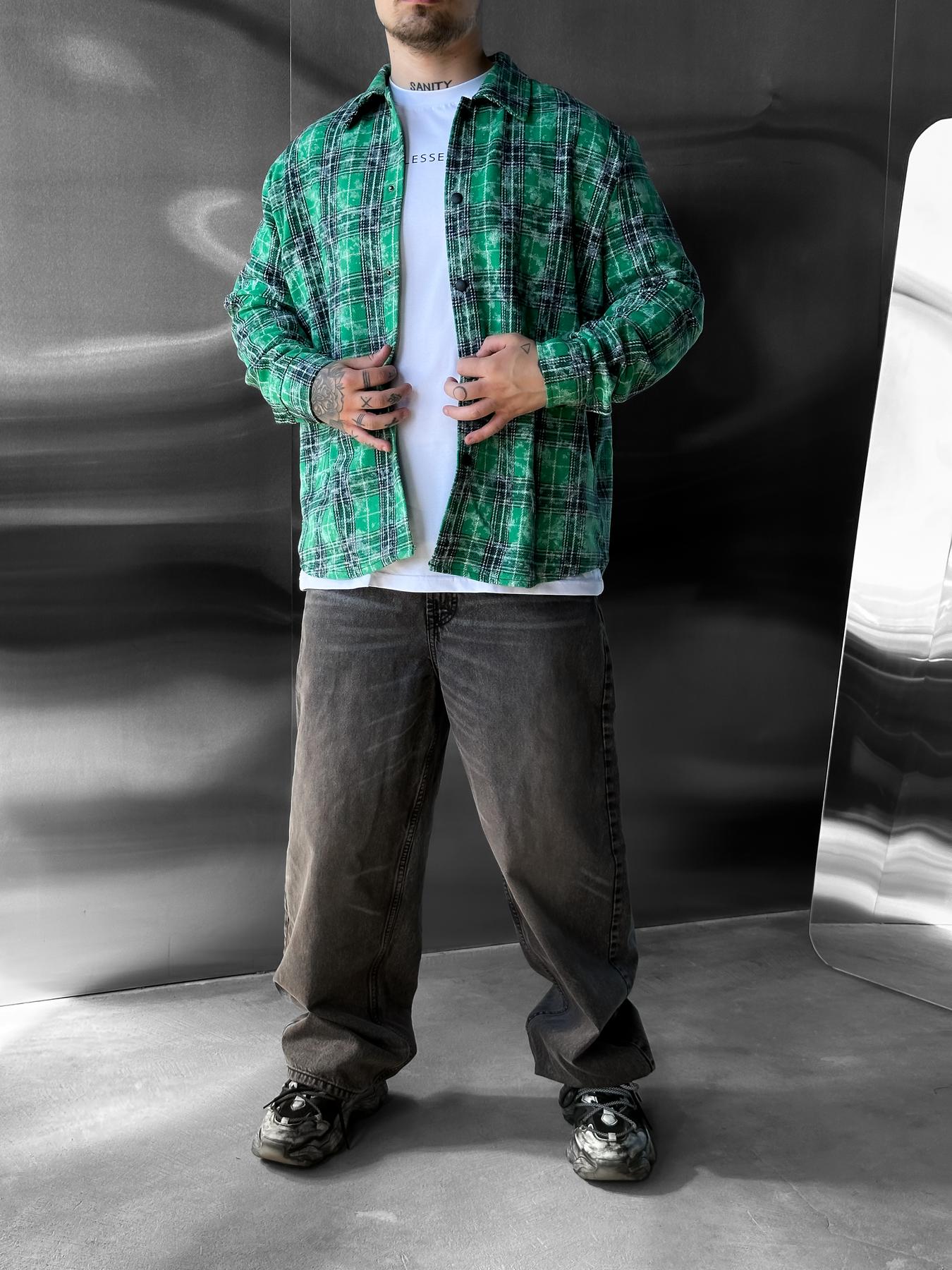Чоловіча Вільна Бавовняна Зелена Сорочка – Клітчаста з Плямами