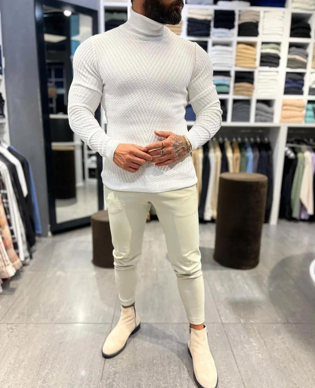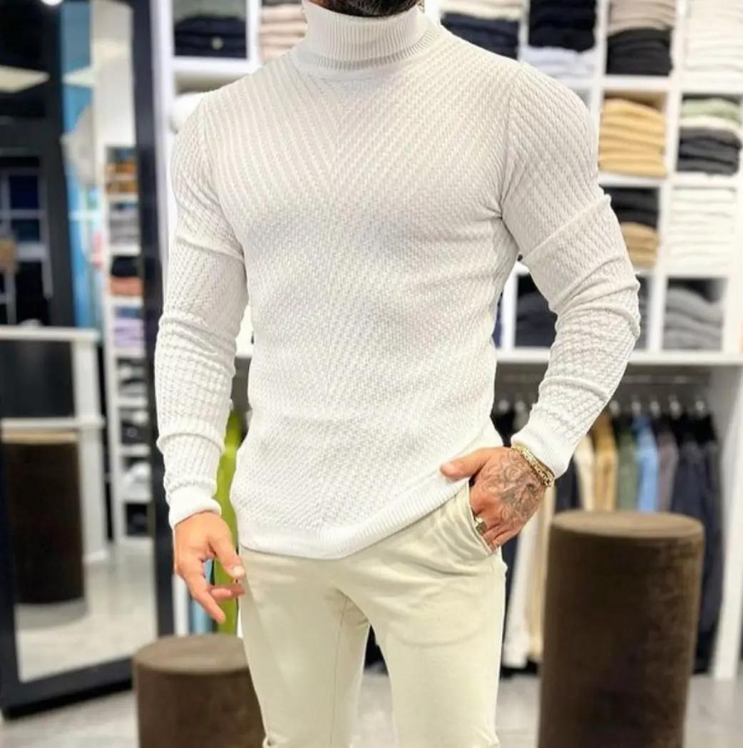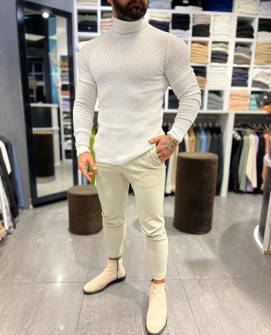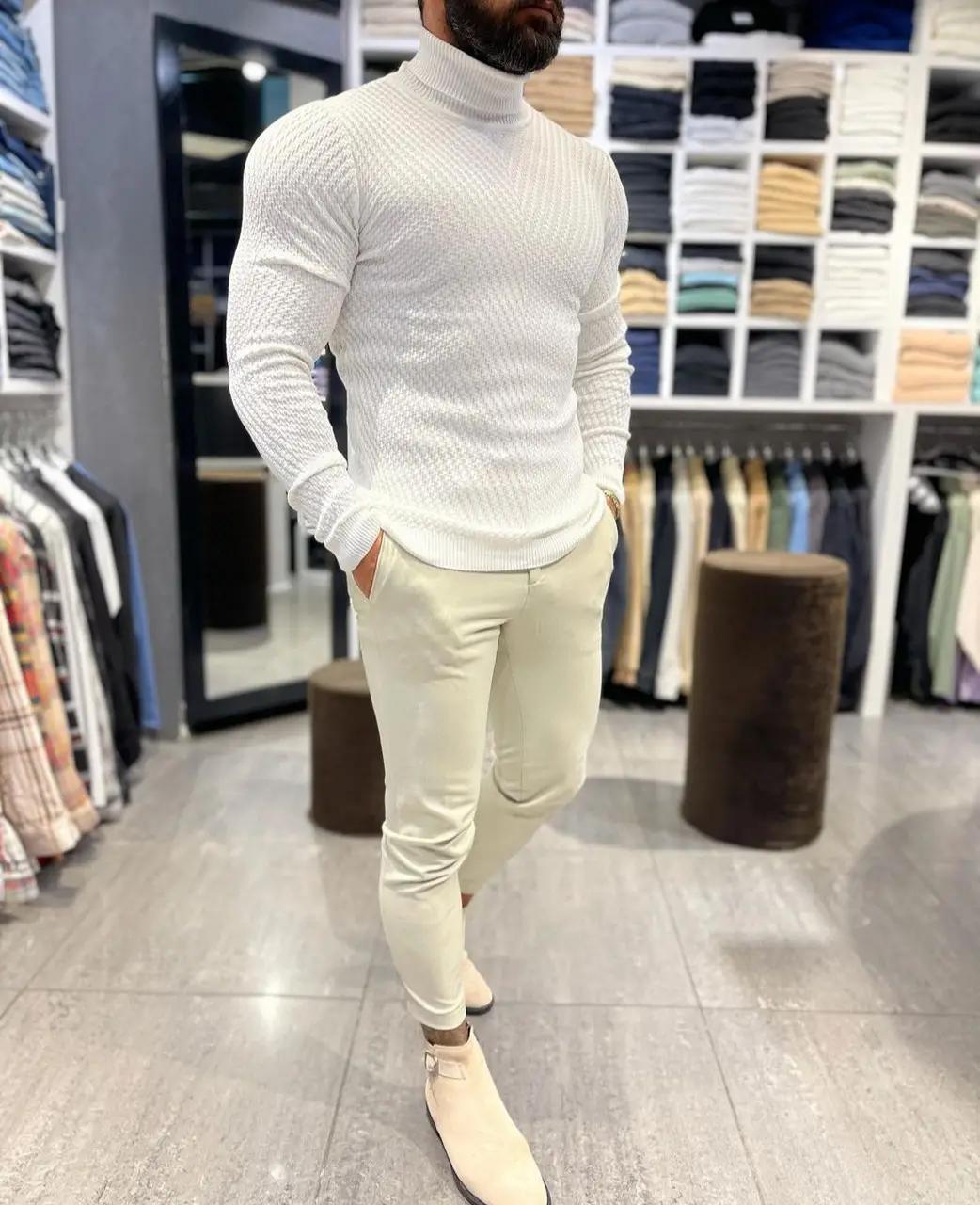 Чоловічий Базовий Білий Светр Гольф – Приталений з Високою Подвійною Горловиною