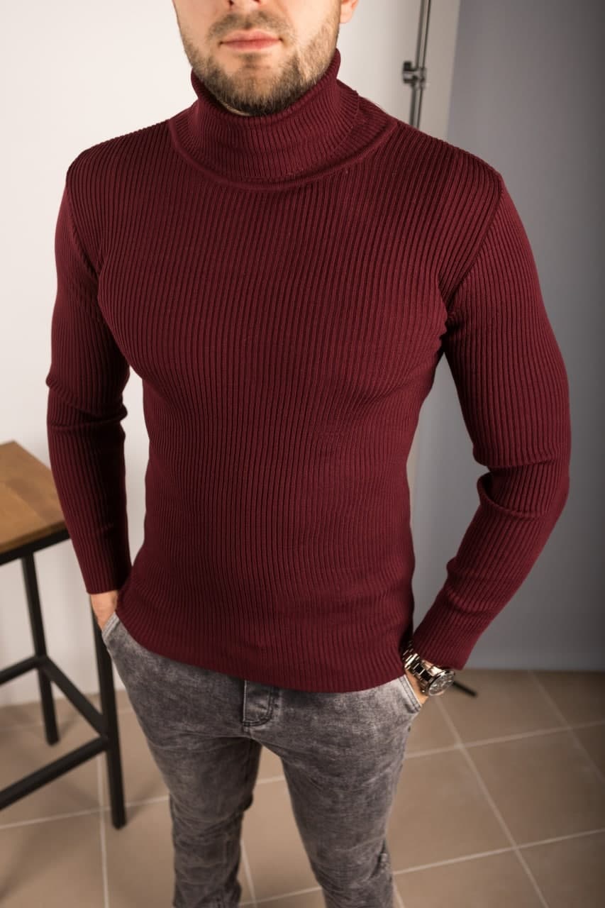 Чоловічий базовий бордовий светр Гольф в Рубчик з подвійним горлом