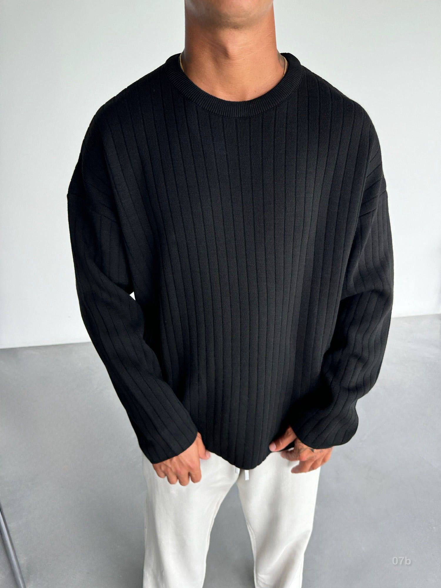 Чоловічий Базовий Чорний Светр Оверсайз з Круглим Вирізом у Широкий Рубчик
