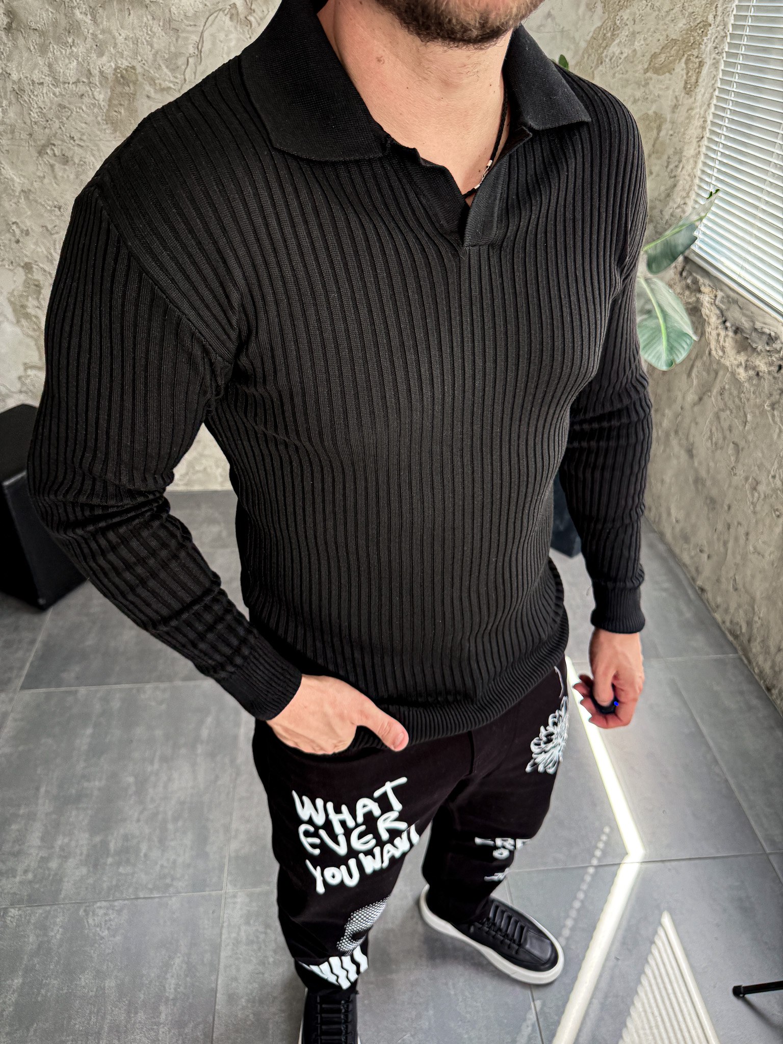 Чоловічий Базовий Чорний Светр у Рубчик – Кофта з Коміром Поло