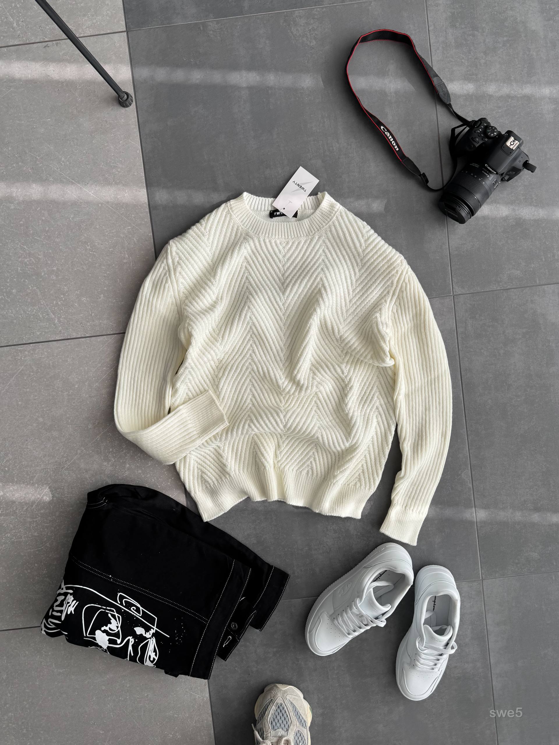 Чоловічий Базовий Молочний Светр з Круглим Вирізом та Фактурним Візерунком