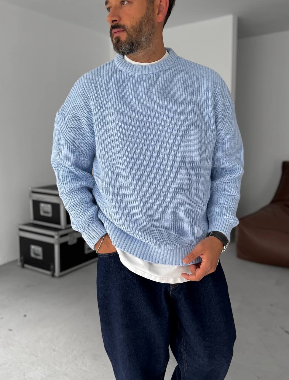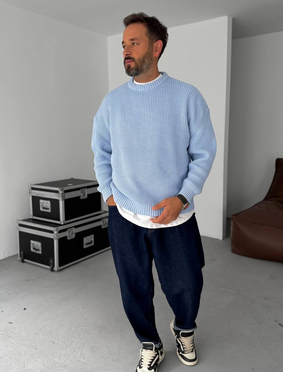Чоловічий Базовий В’язаний Блакитний Светр Бавовна Оверсайз