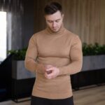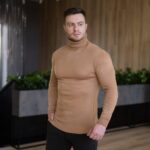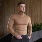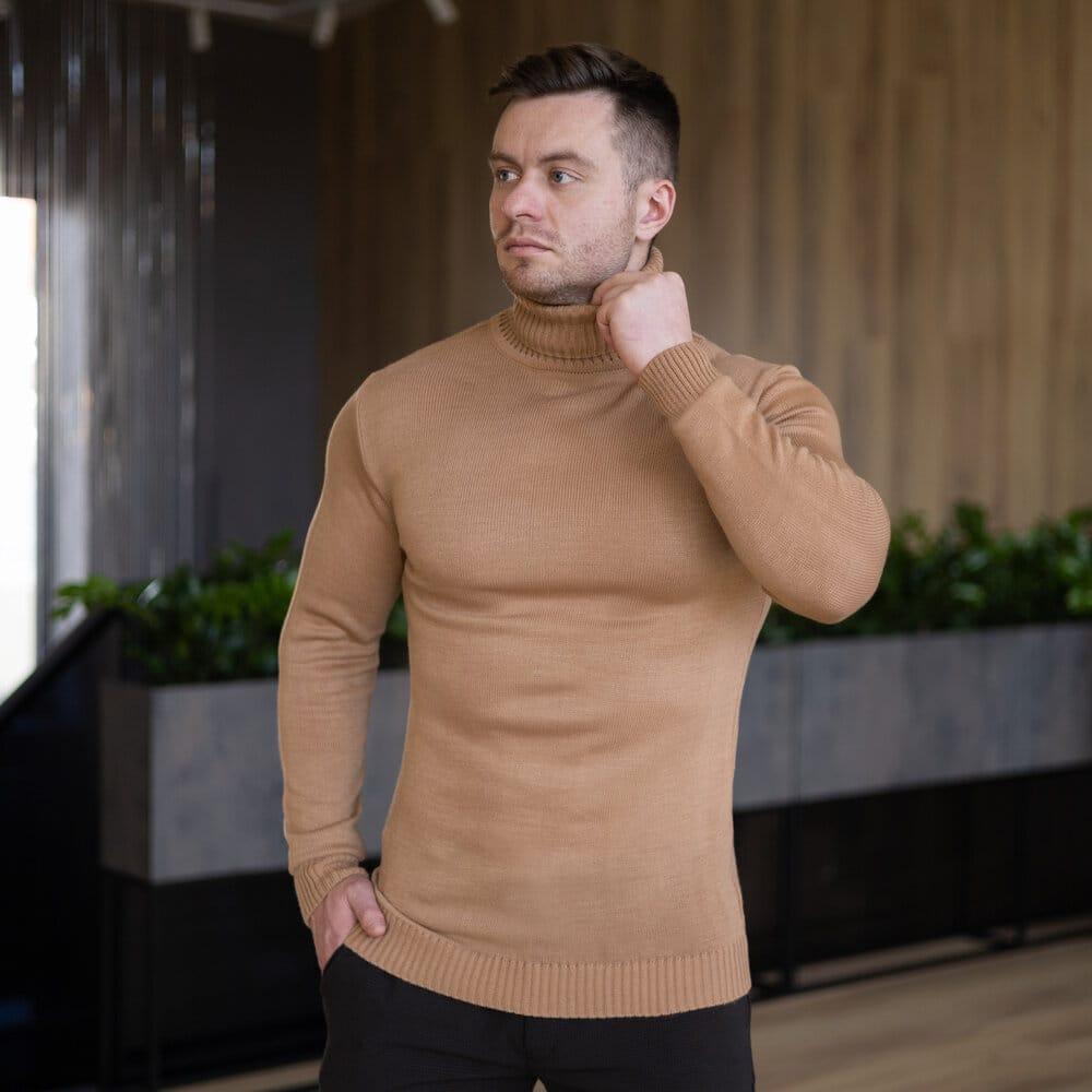 Чоловічий Класичний Бежевий светр Приталеного Крою з Подвійною Горловиною