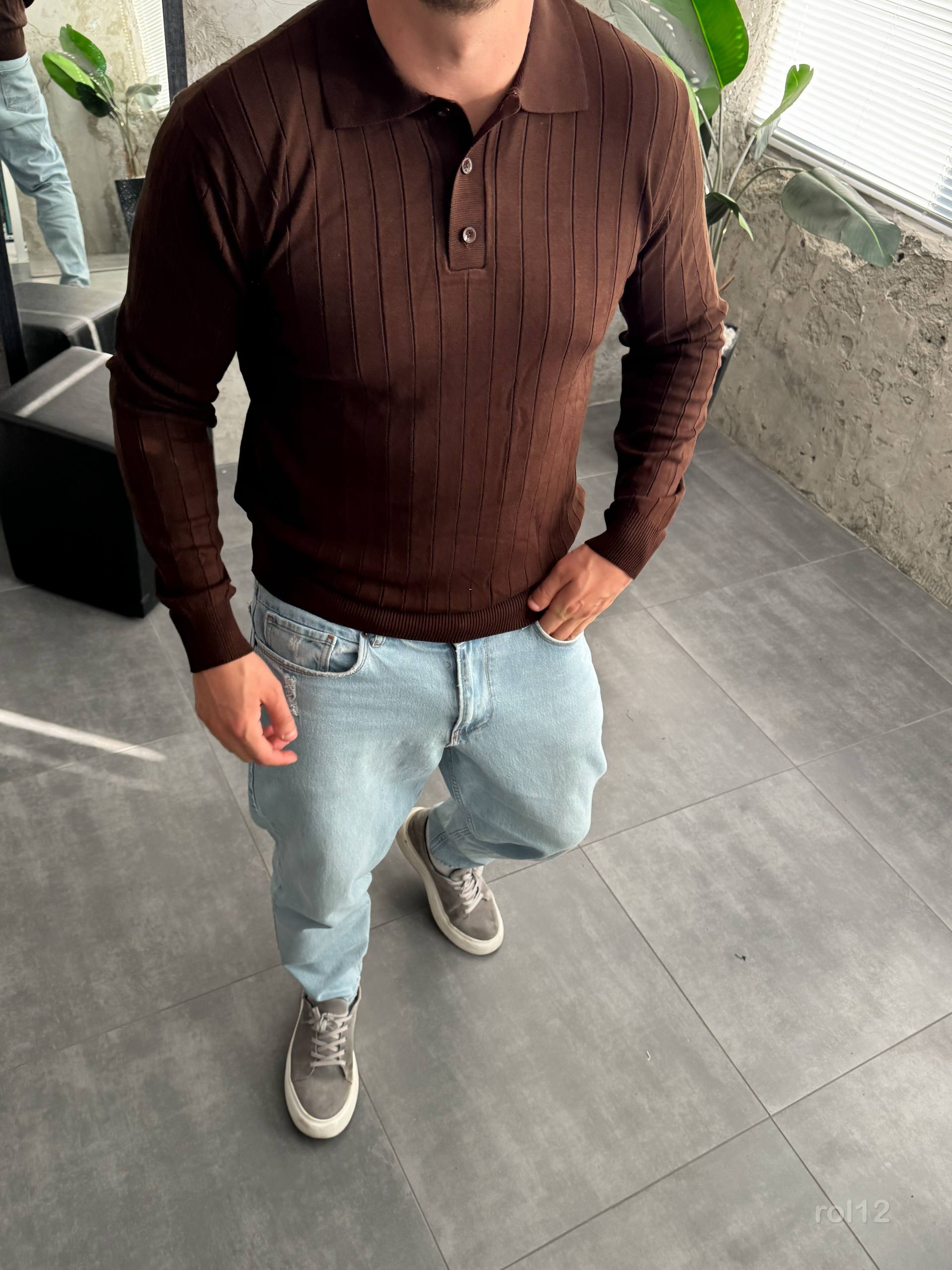 Чоловічий Класичний Коричневий Светр Поло в Широкий Рубчик