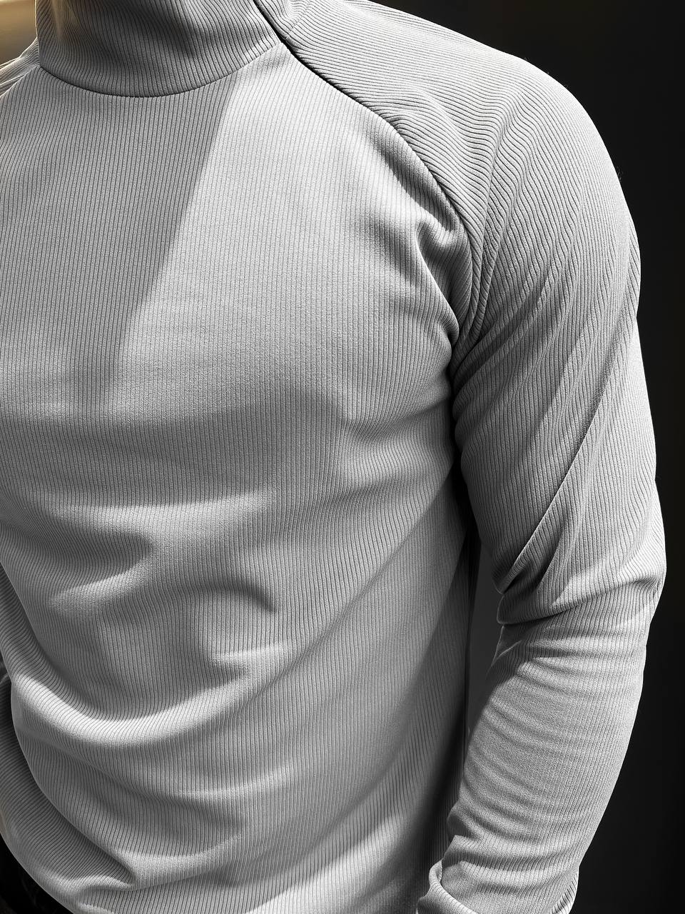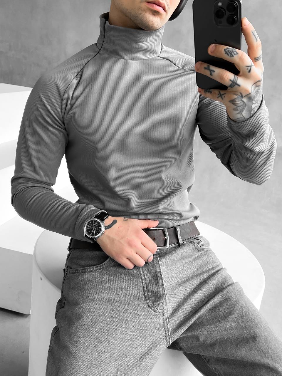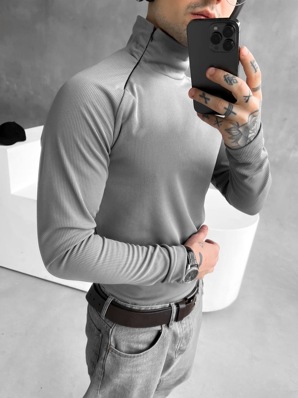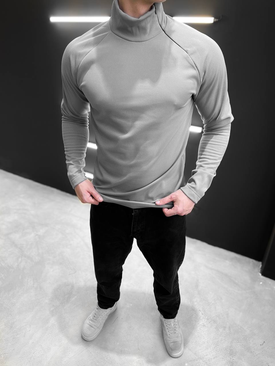 Чоловічий Сірий Гольф в Рубчик з Блискавкою на Комірі – Утеплений на Флісі