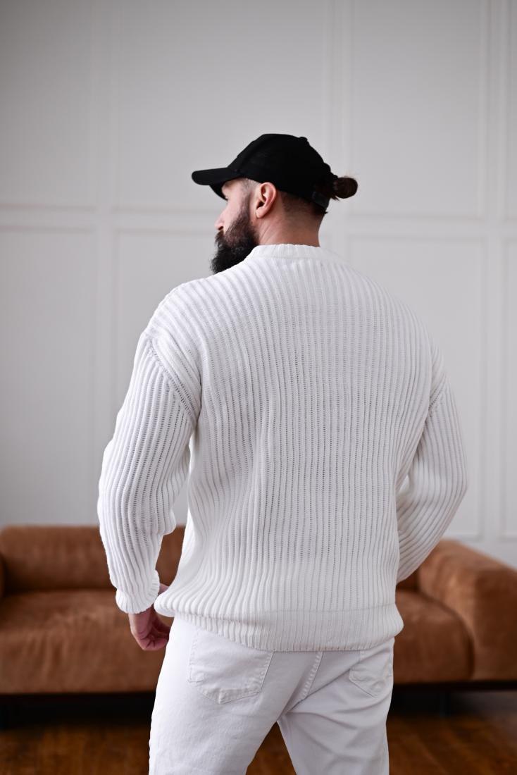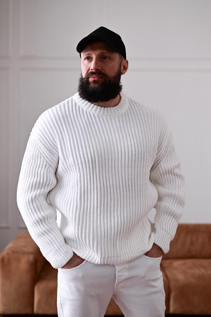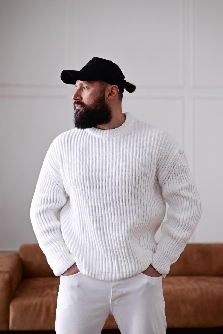 Чоловічий Теплий Базовий Білий Светр Вільного Крою зі Спущеним Плечем