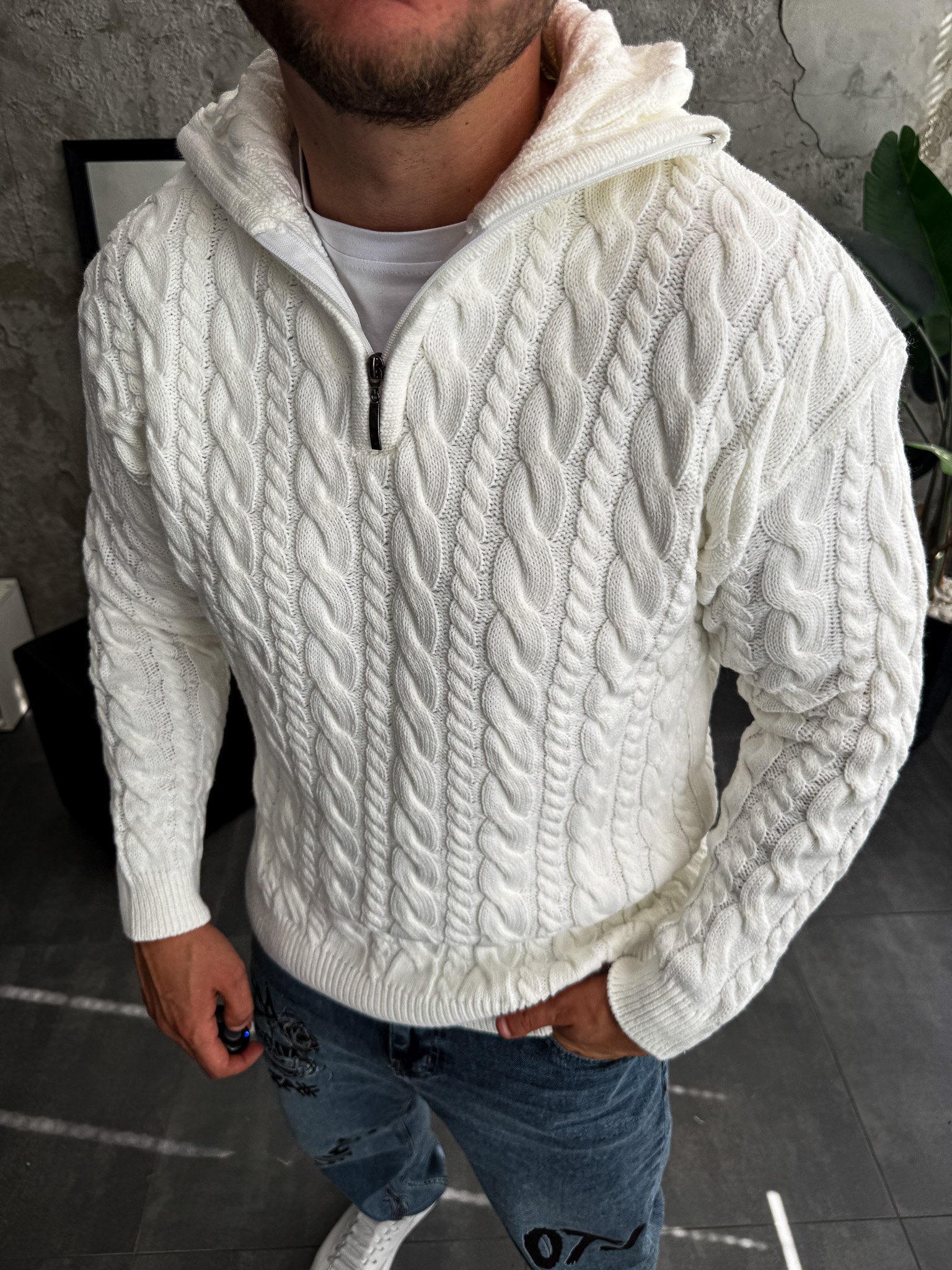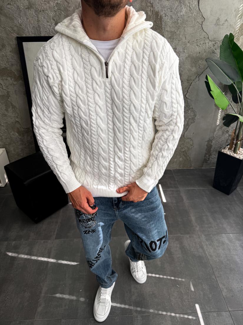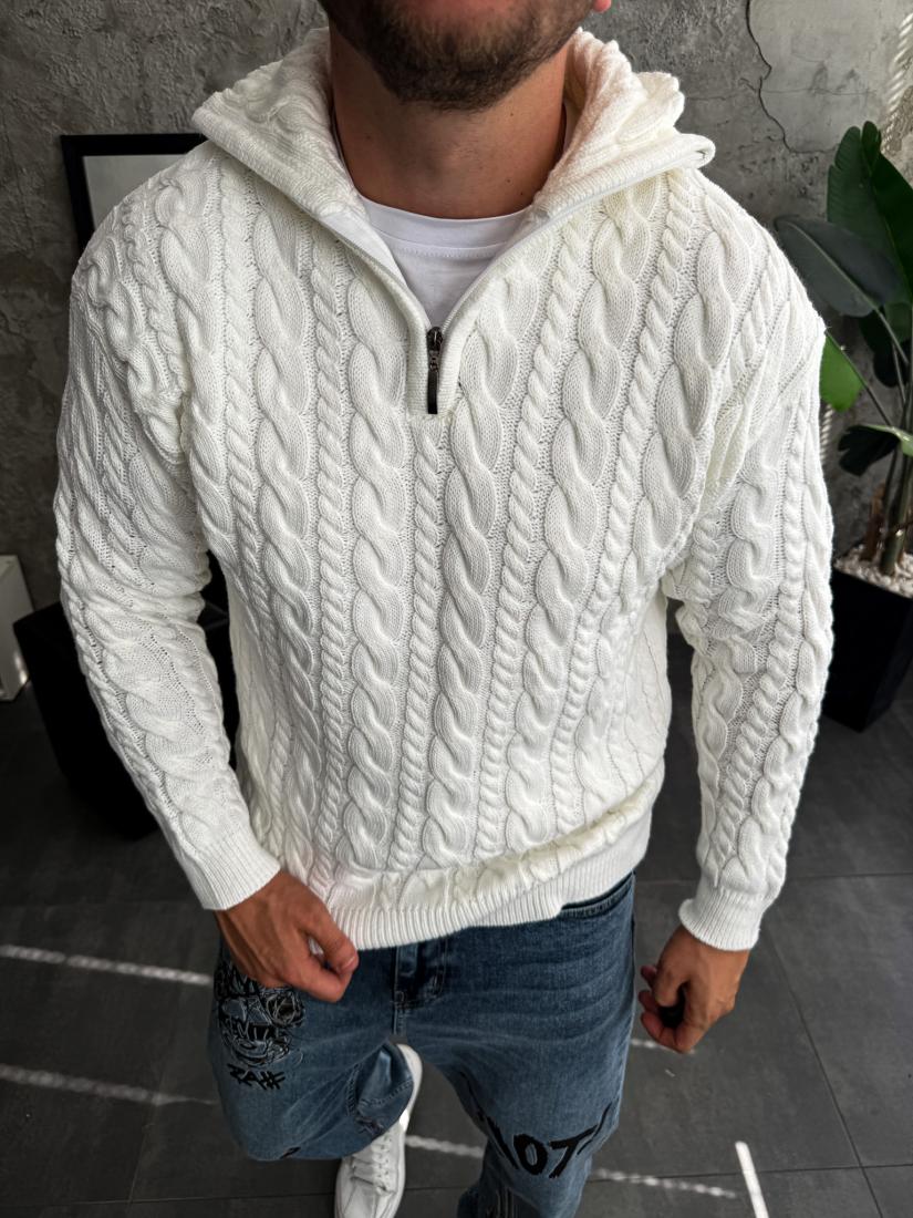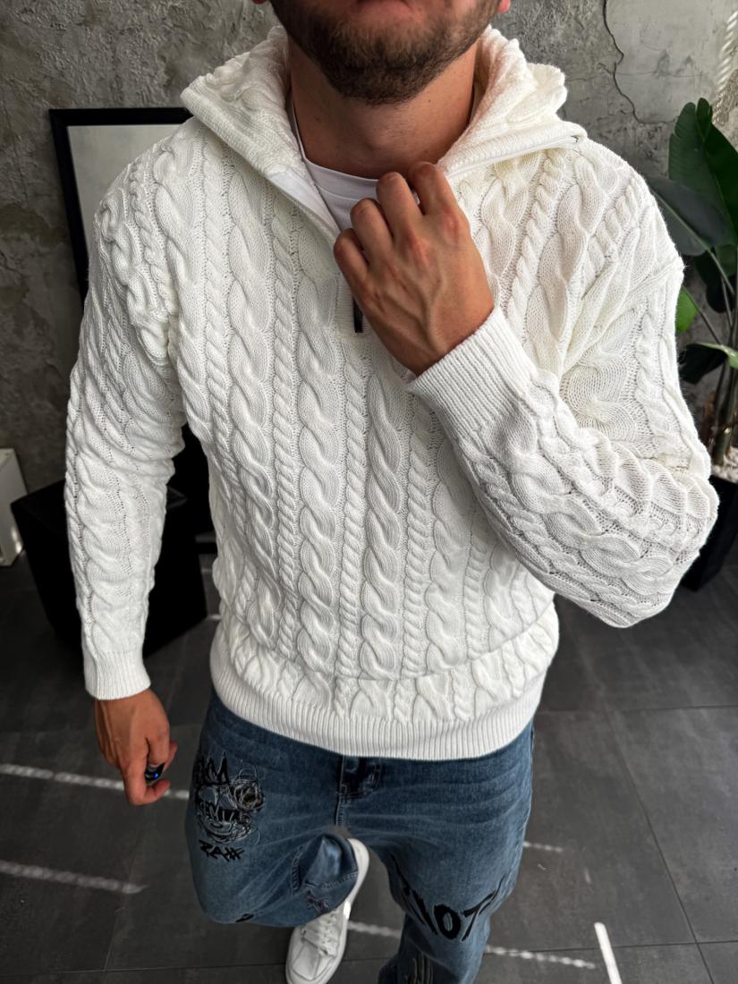 Чоловічий Теплий Білий Светр Оверсайз з Високою Горловиною на Замку та Рельєфним Візерунком Косичка
