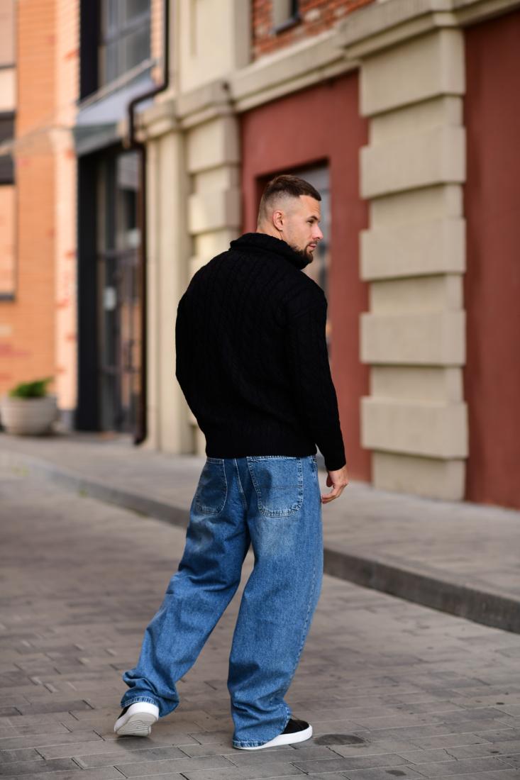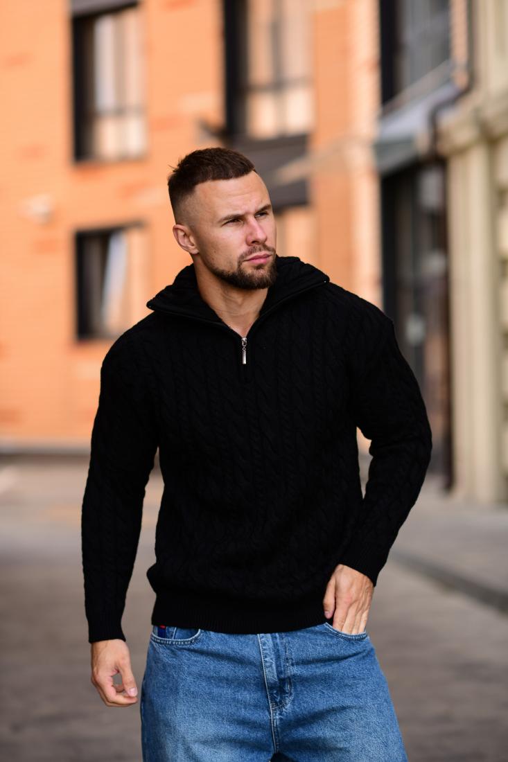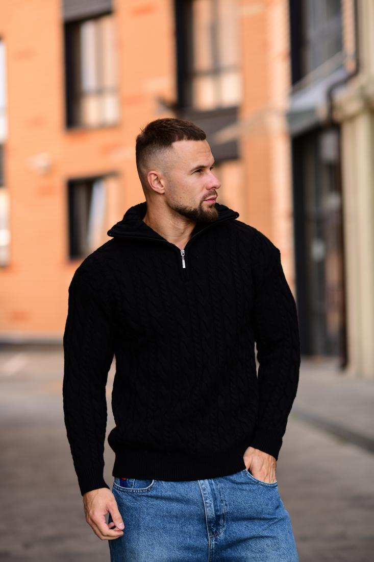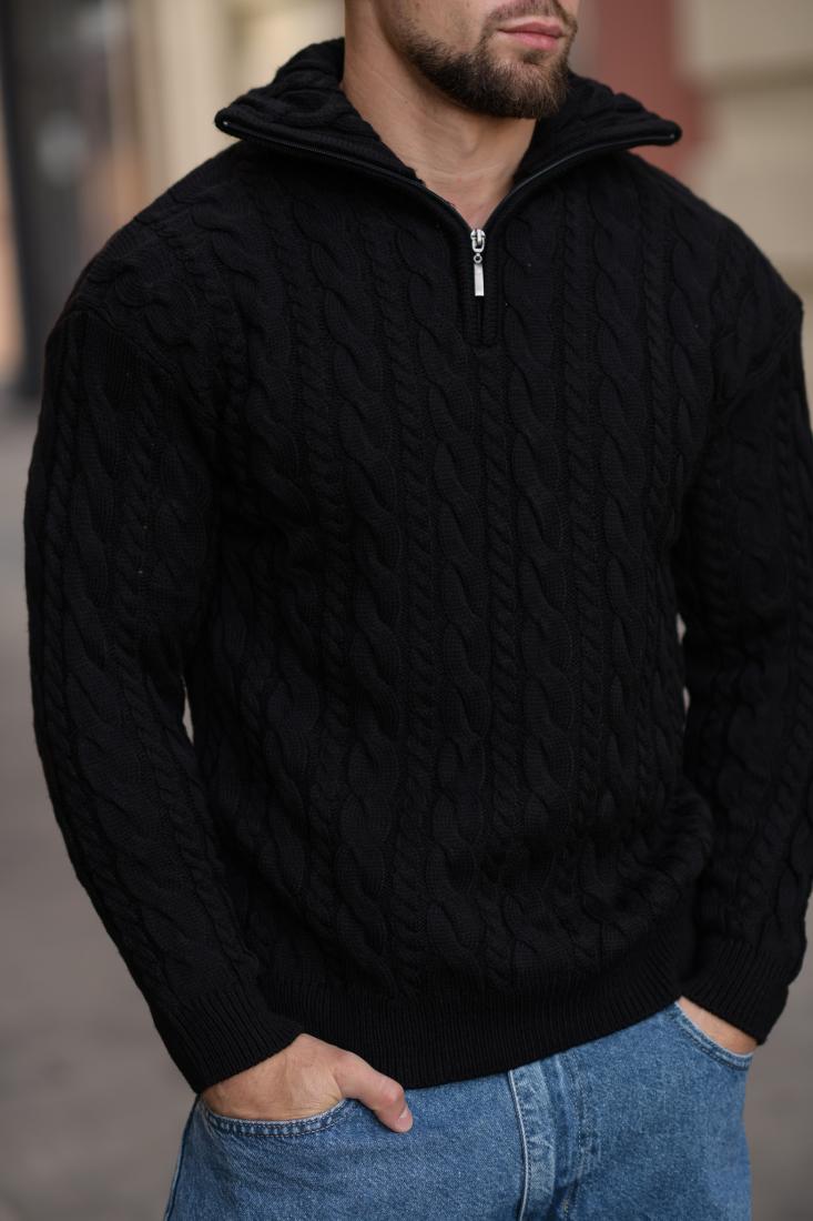 Чоловічий Теплий Чорний Светр Оверсайз з Високою Горловиною на Замку та Рельєфним Візерунком Косичка