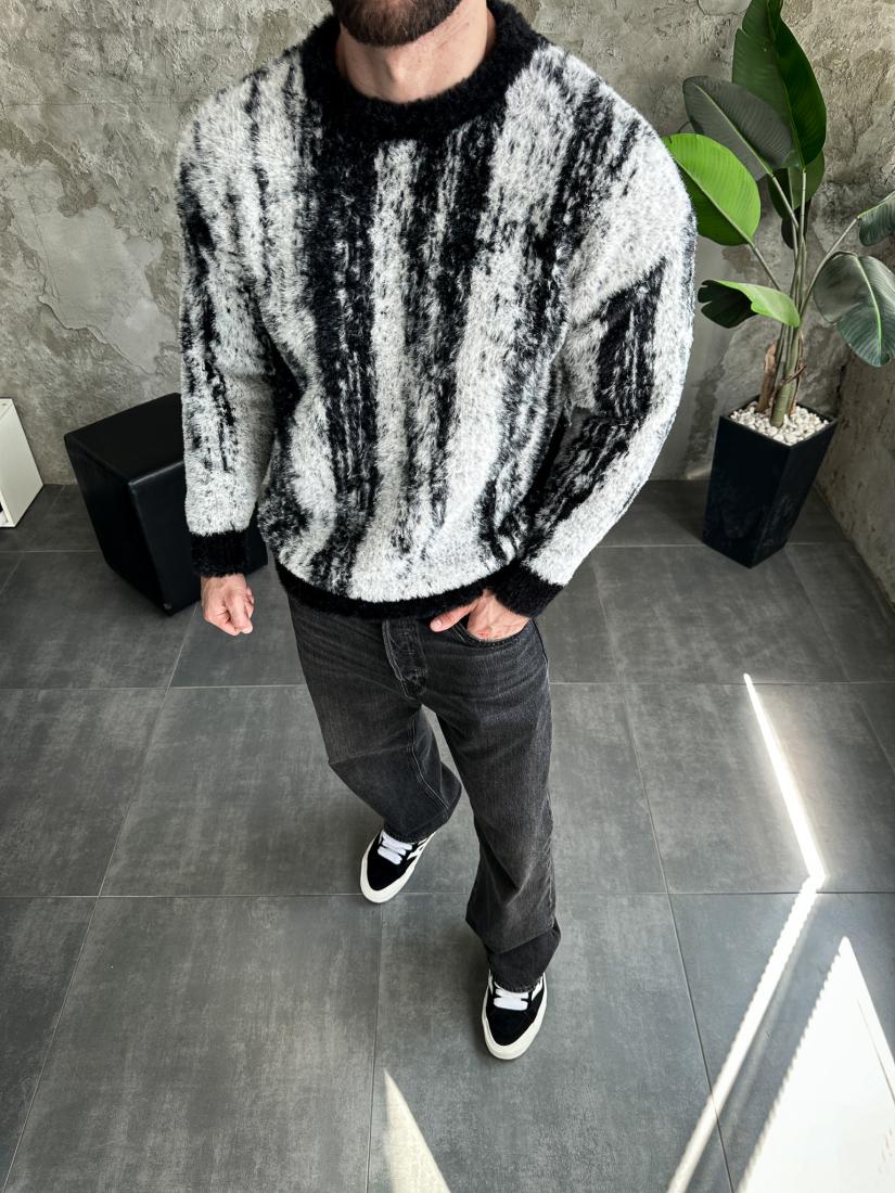 Чоловічий Теплий Пухнастий Чорно-Білий Светр з Візерунком