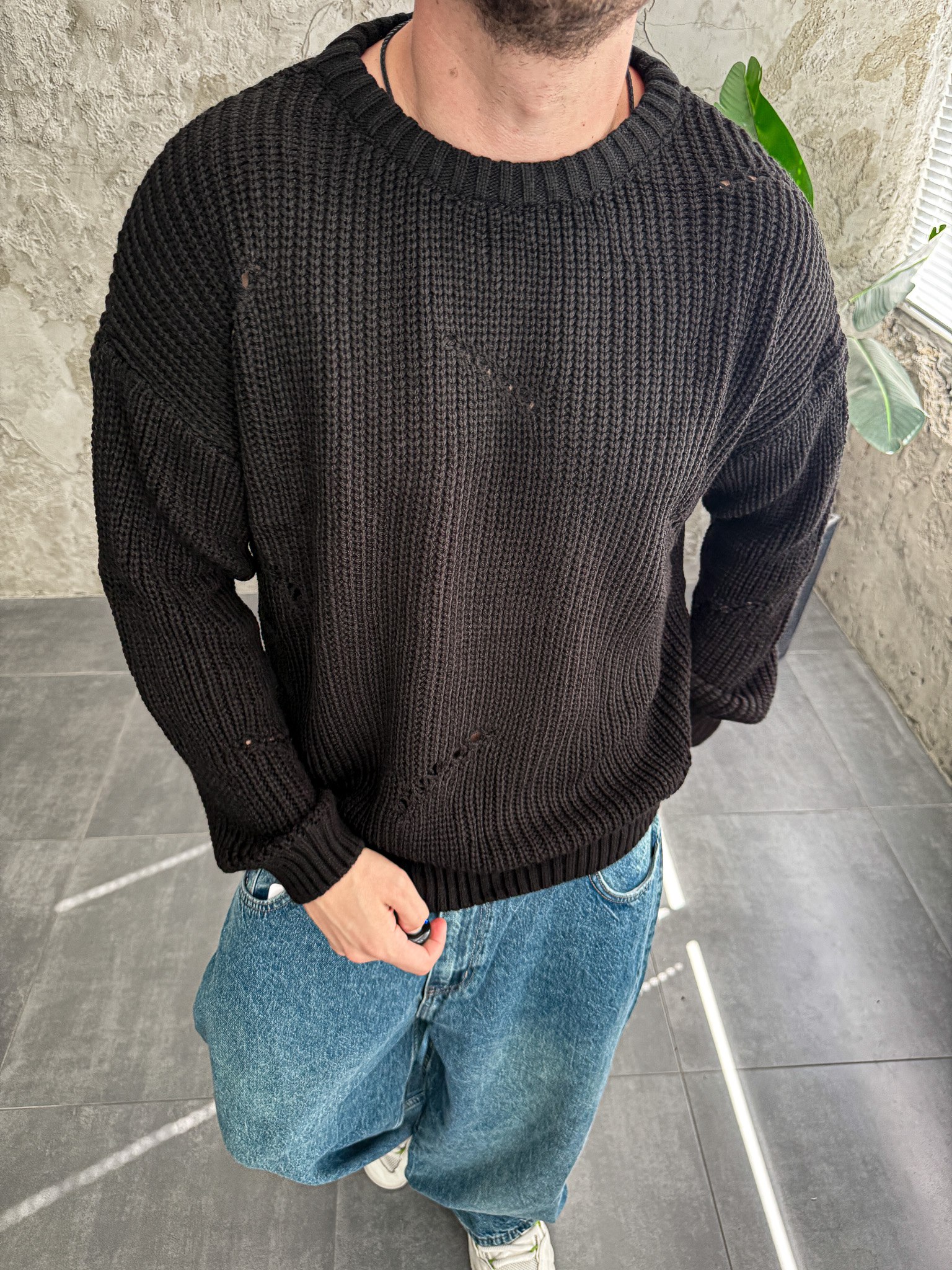 Чоловічий Теплий В’язаний Чорний Светр Оверсайз Рваний