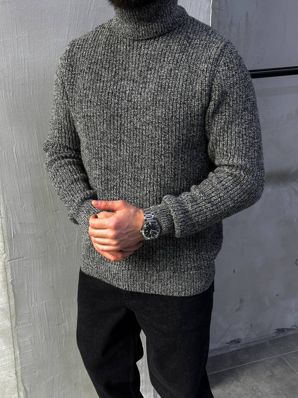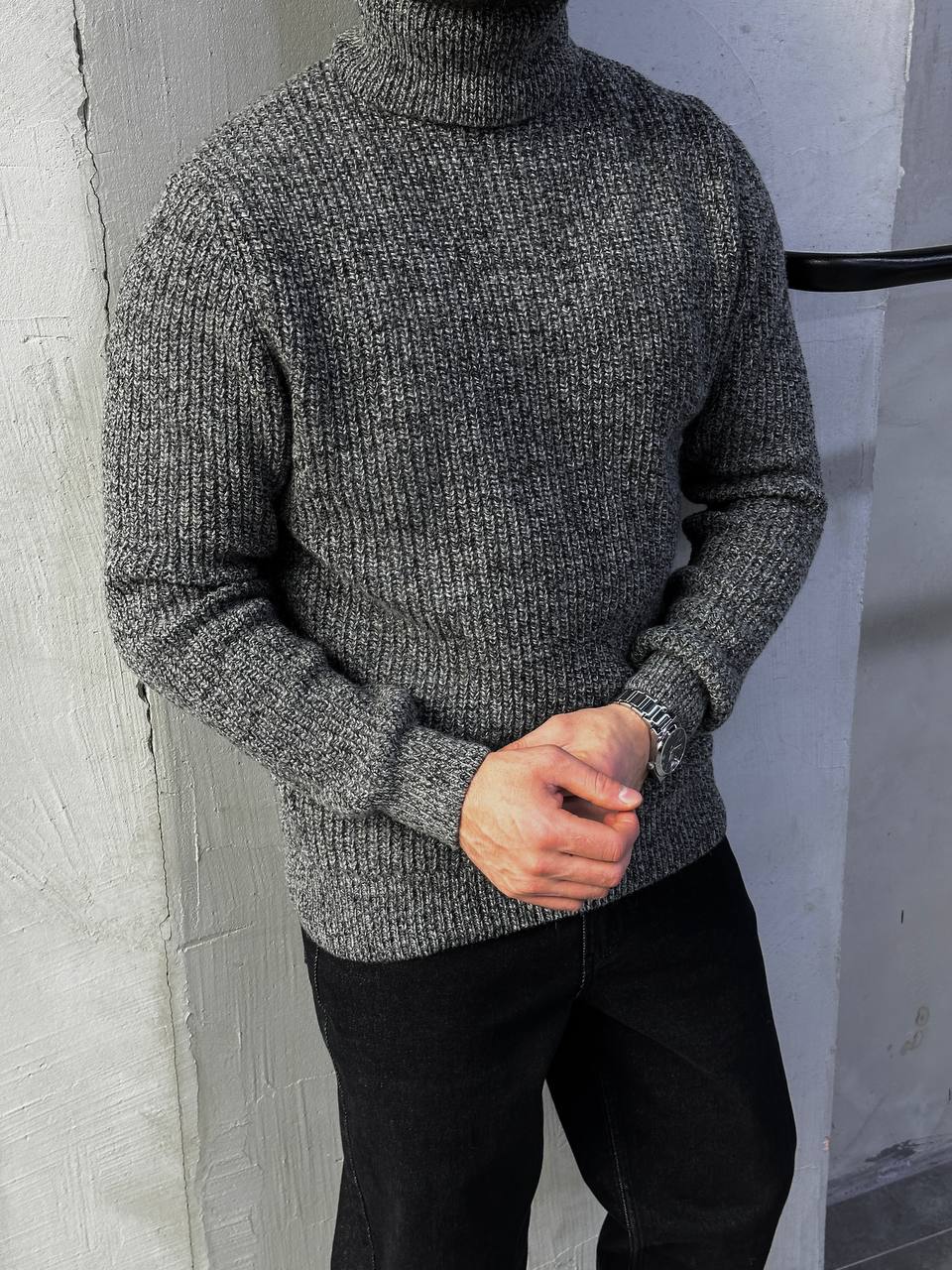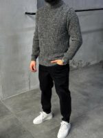 Чоловічий Теплий В’язаний Графітовий Светр Гольф з Подвійною Горловиною