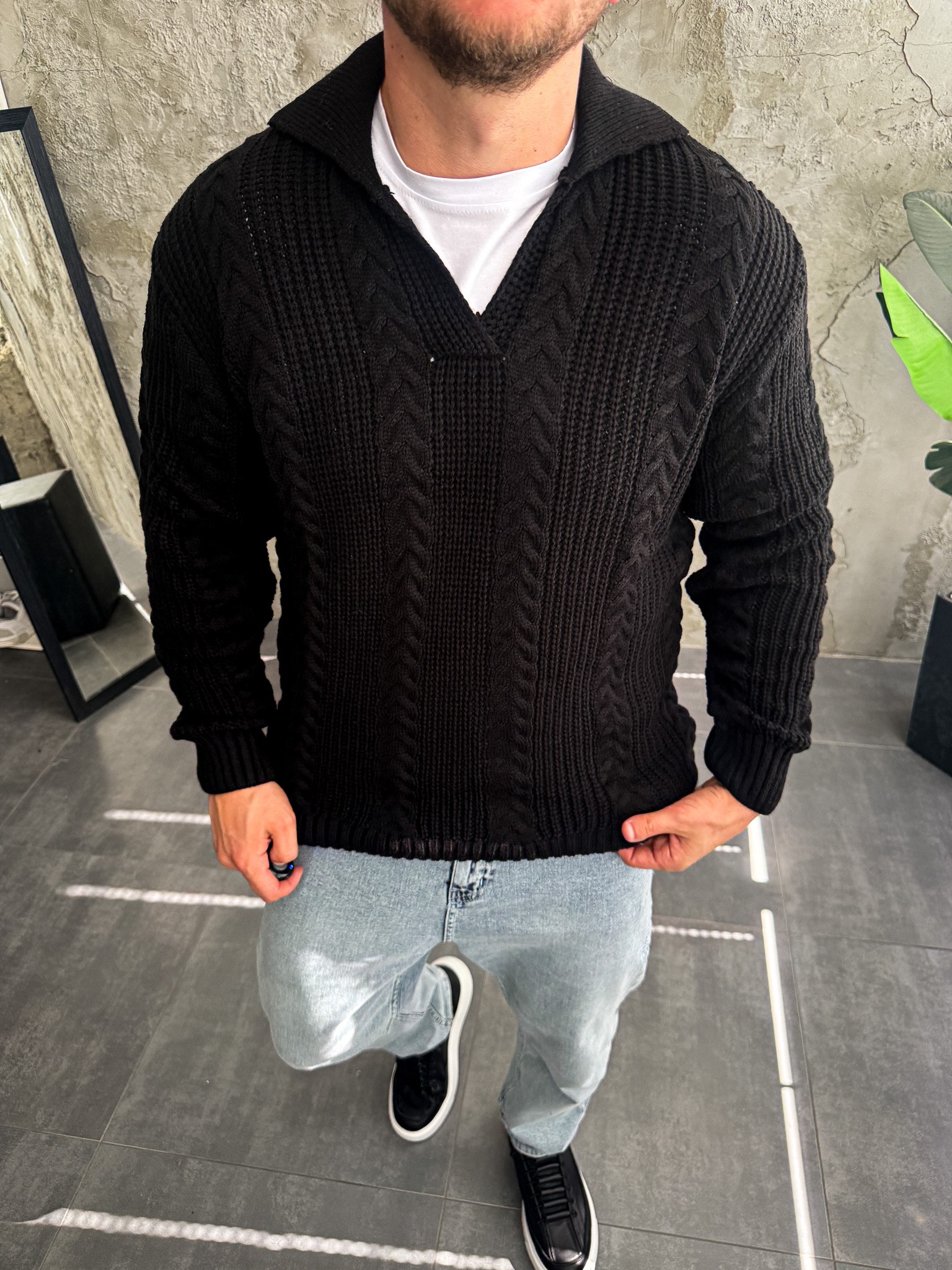 Чоловічий В’язаний Чорний Светр з Коміром Поло та Рельєфним Візерунком