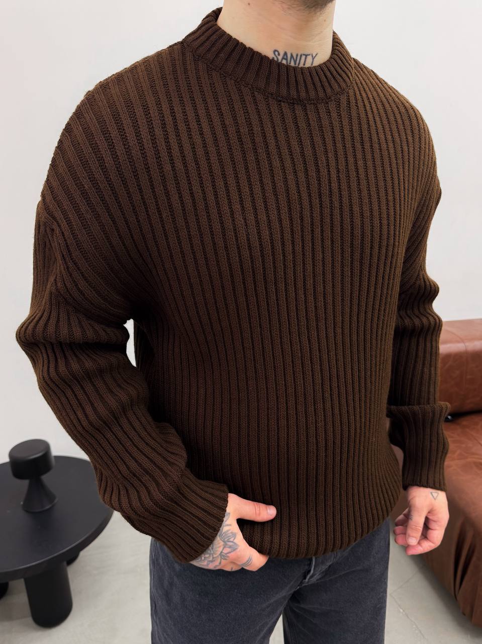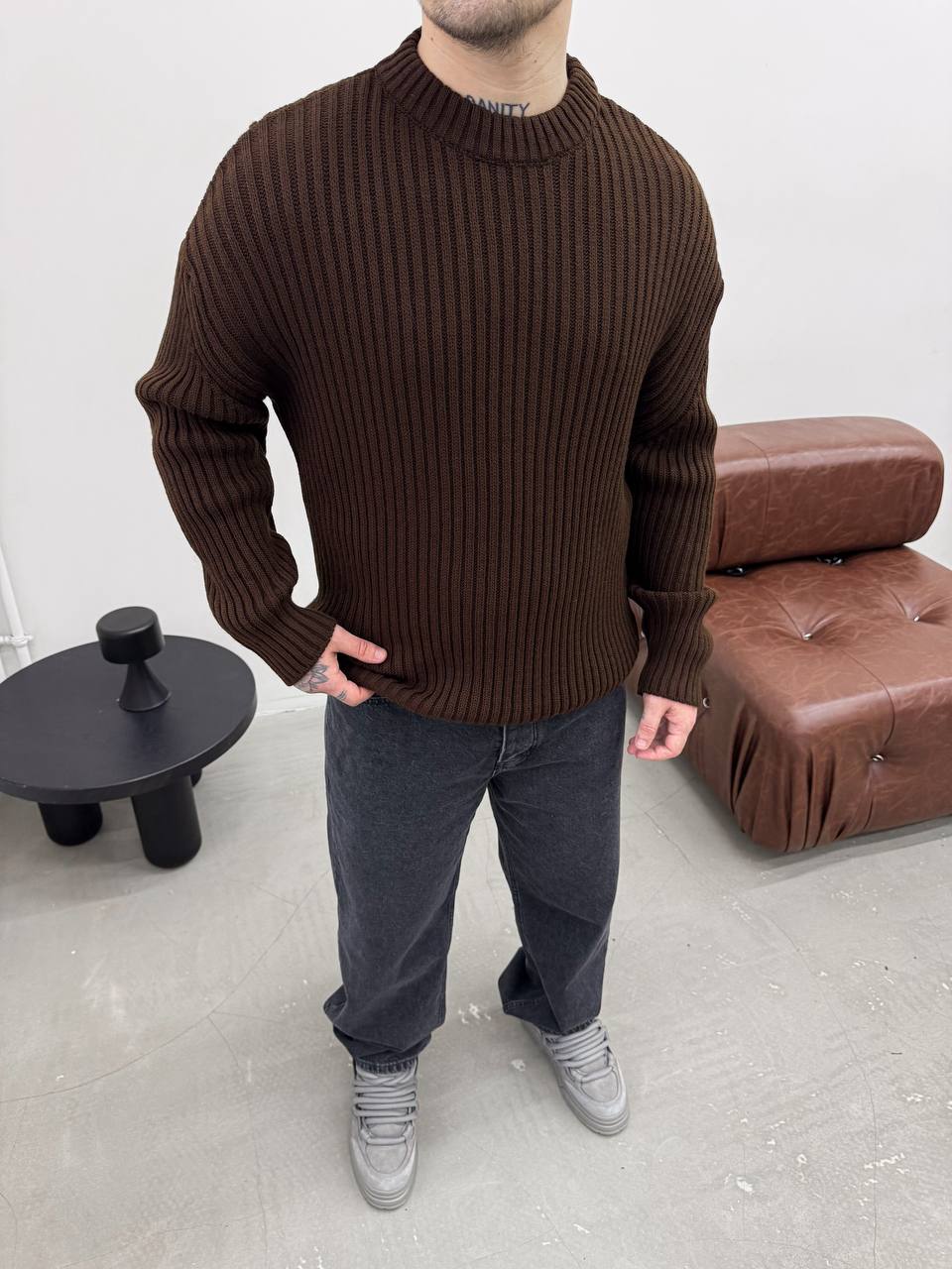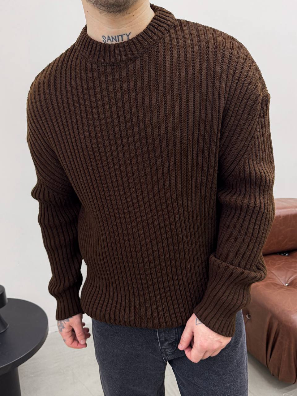 Чоловічий В’язаний Коричневий Светр Джемпер Оверсайз з Круглим Вирізом