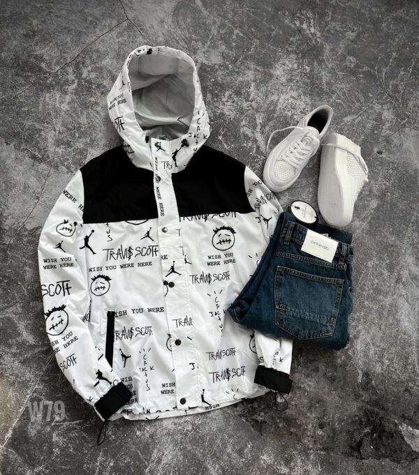 Чоловіча Біла Вітровка у Принтах Написах – з Капюшоном та Липучками на Манжетах