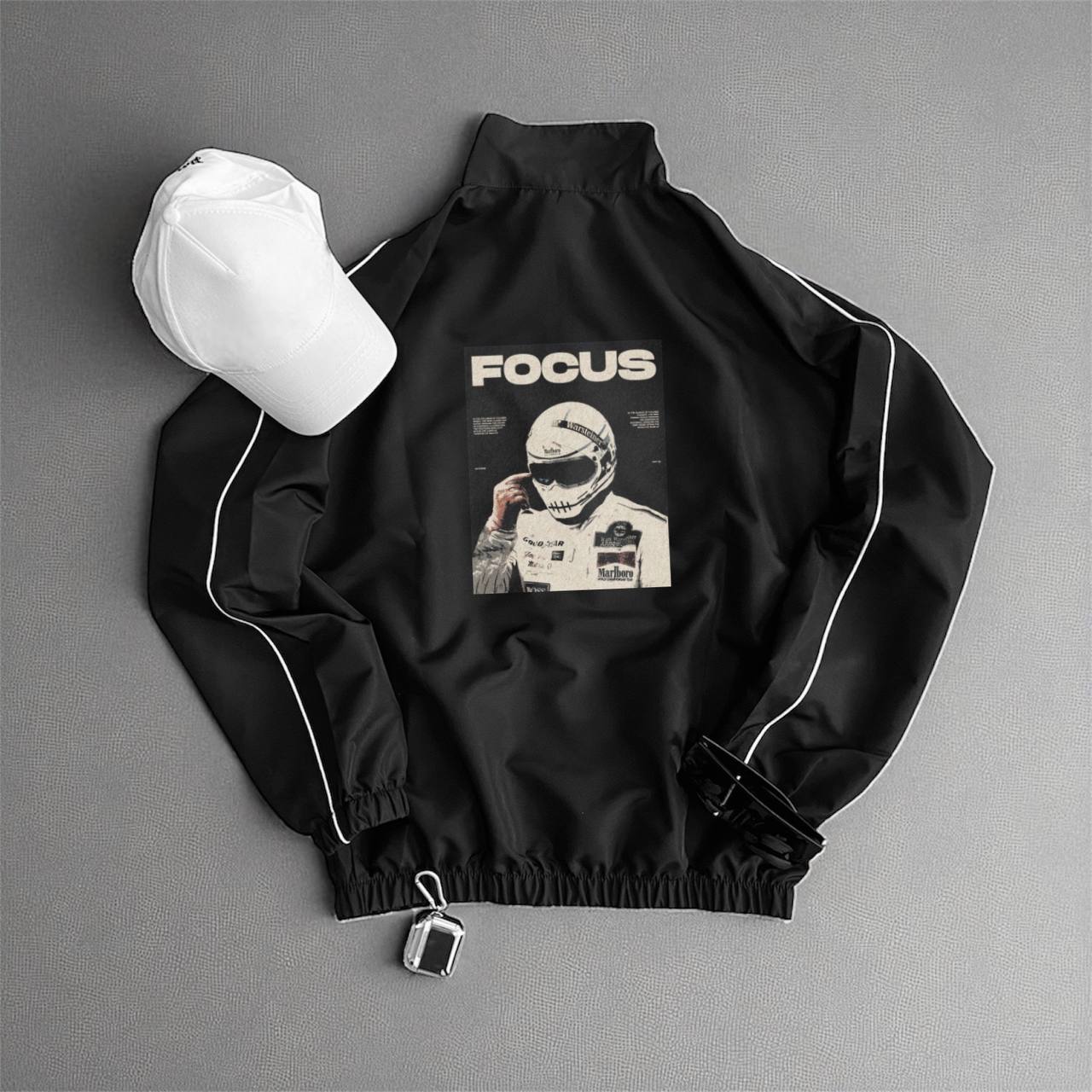 Чоловіча Чорна Вітровка Олімпійка Оверсайз з Кантом та Принтом на Спині “Focus”