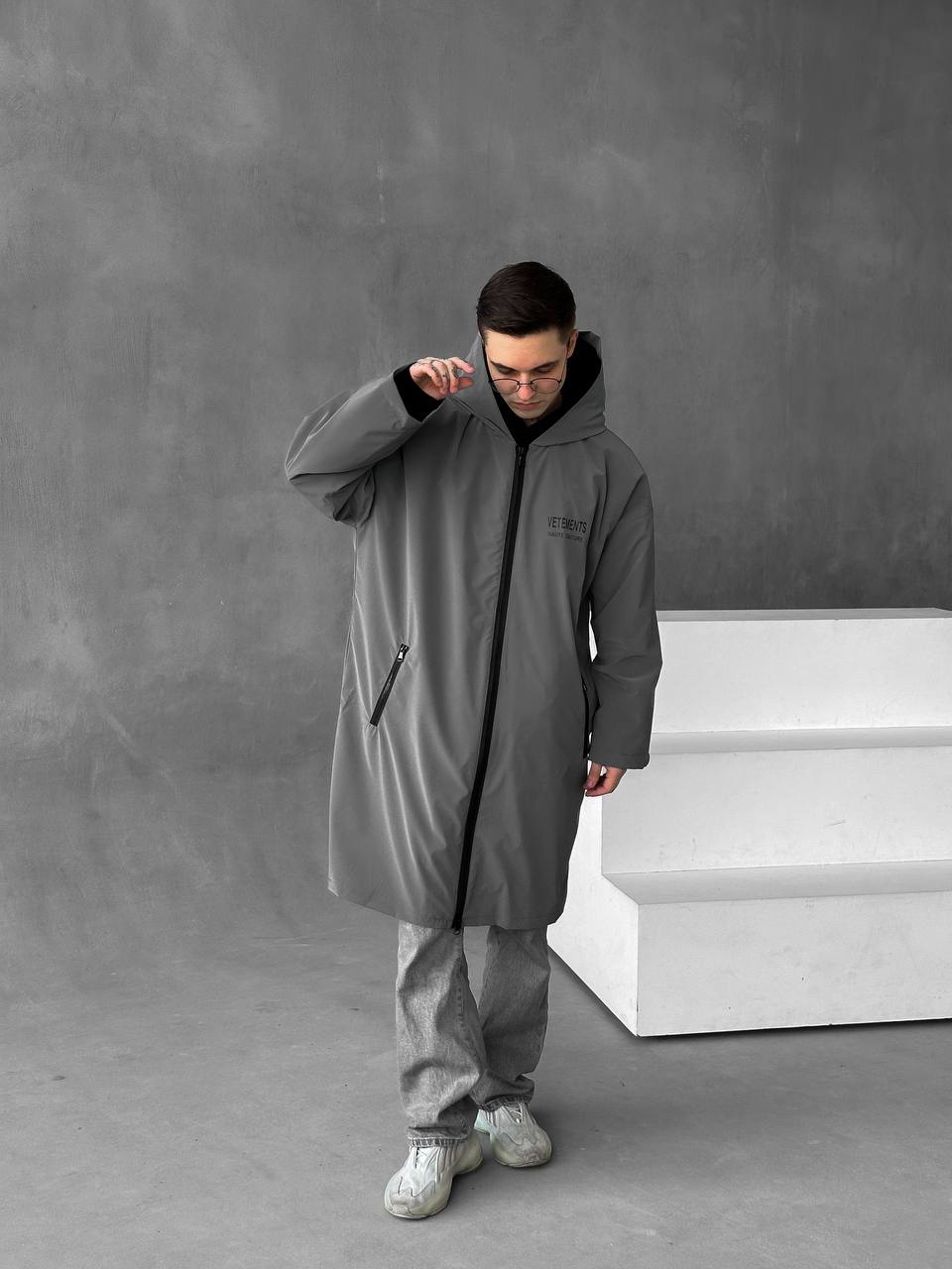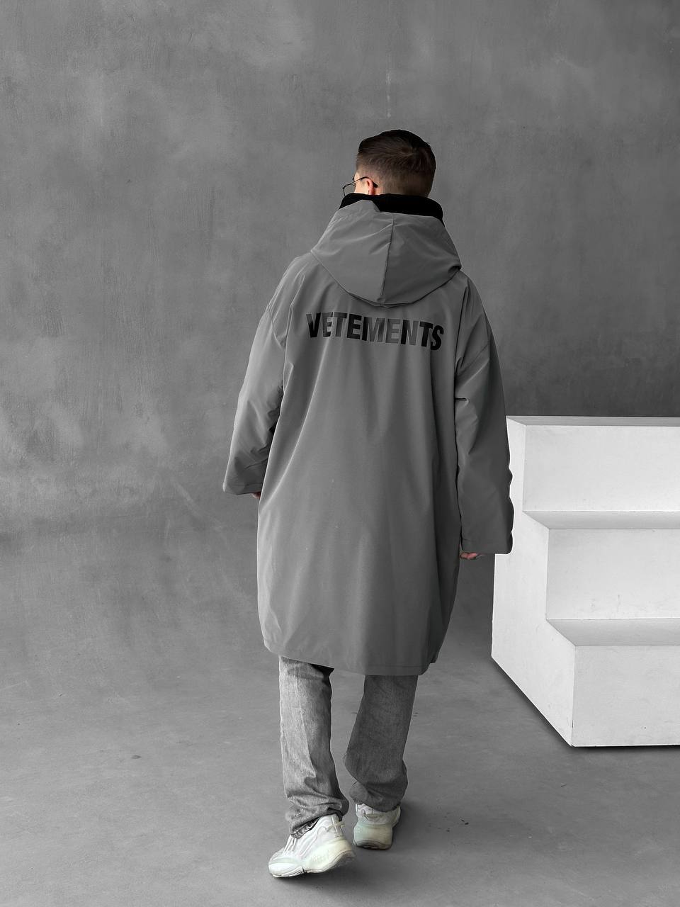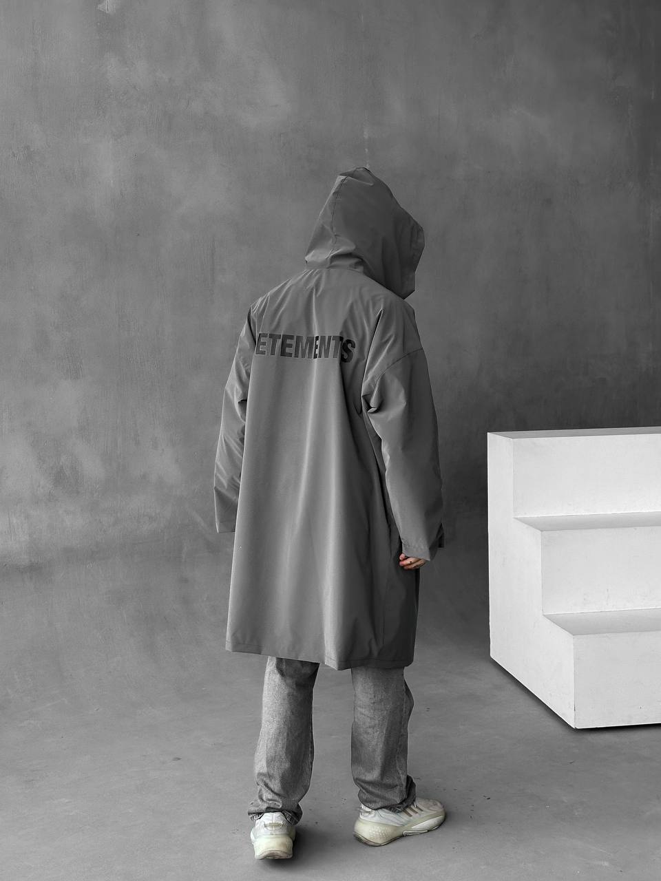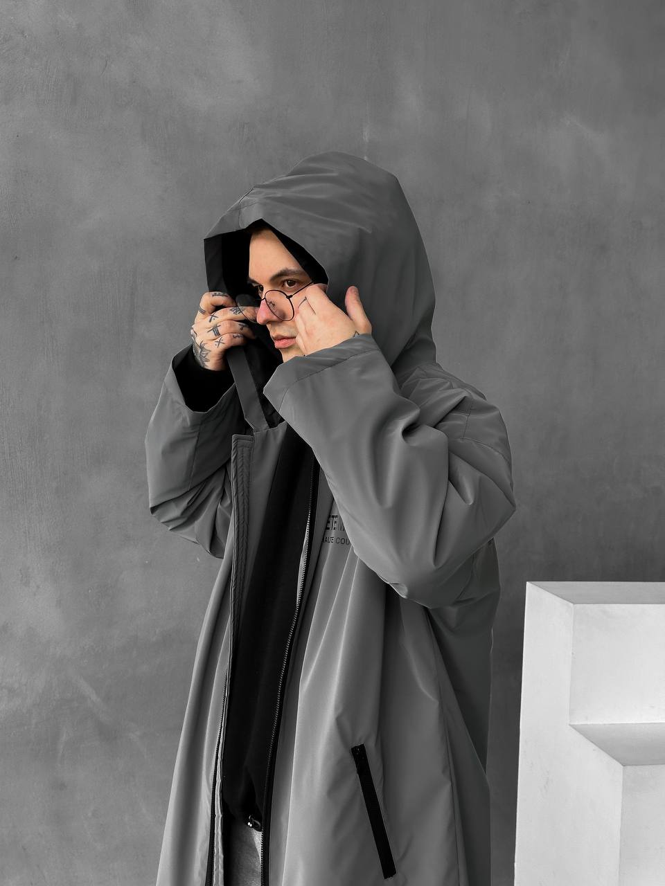 Чоловіча Подовжена Графітова Вітрівка Оверсайз Дощовик з Капюшоном і Написом на Спині