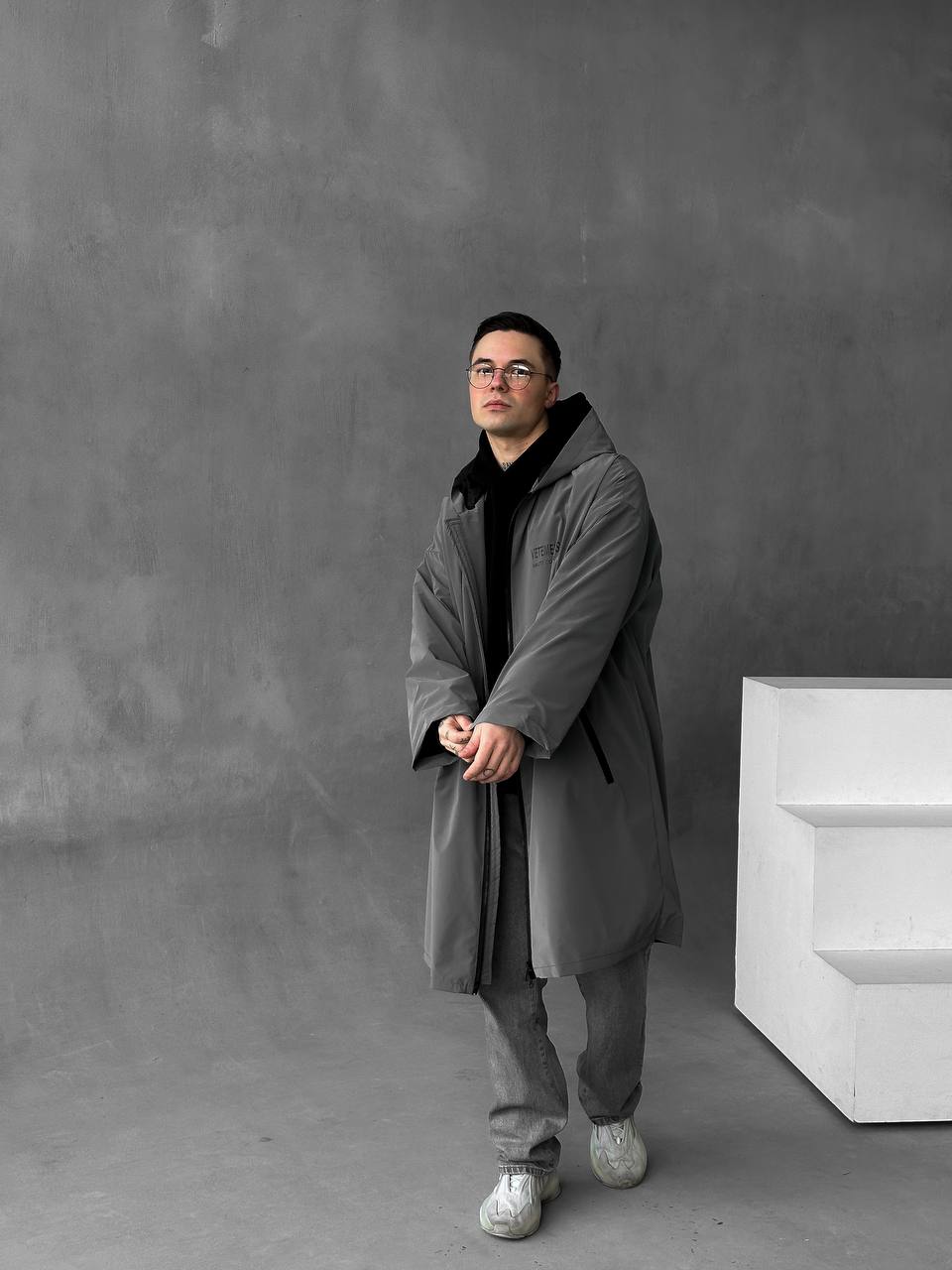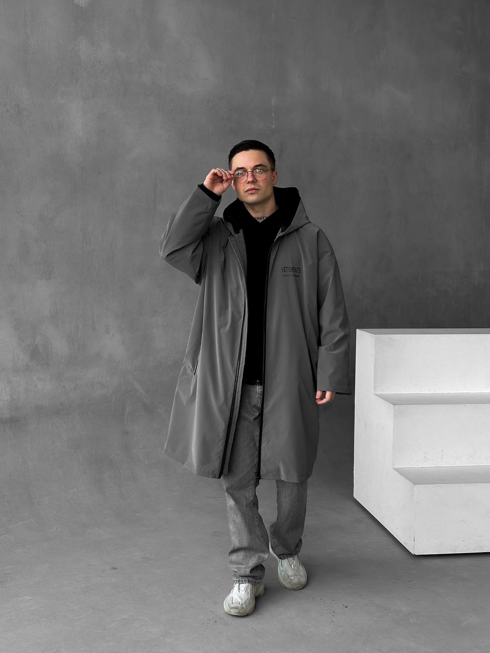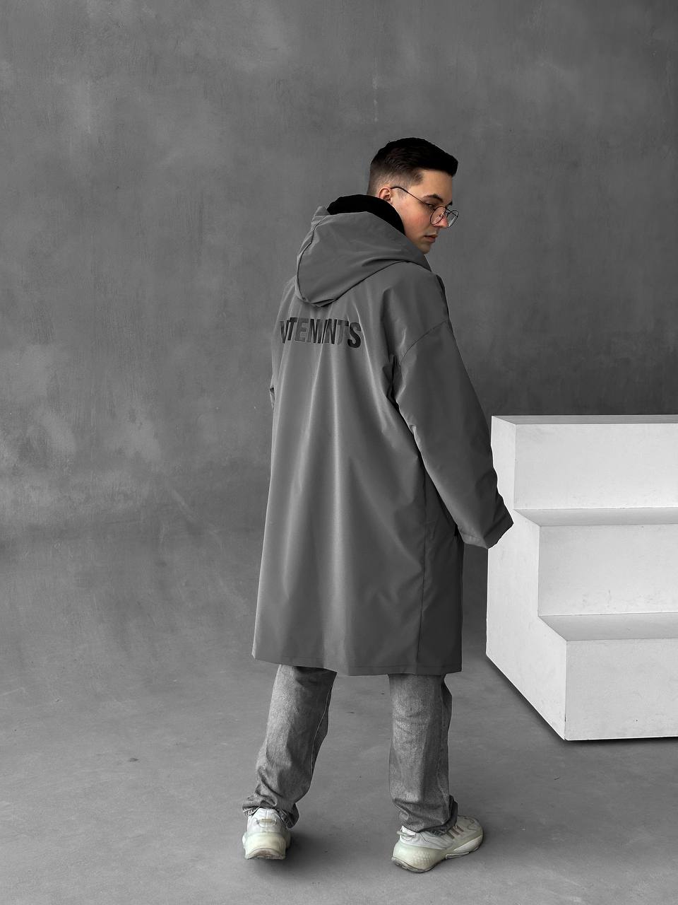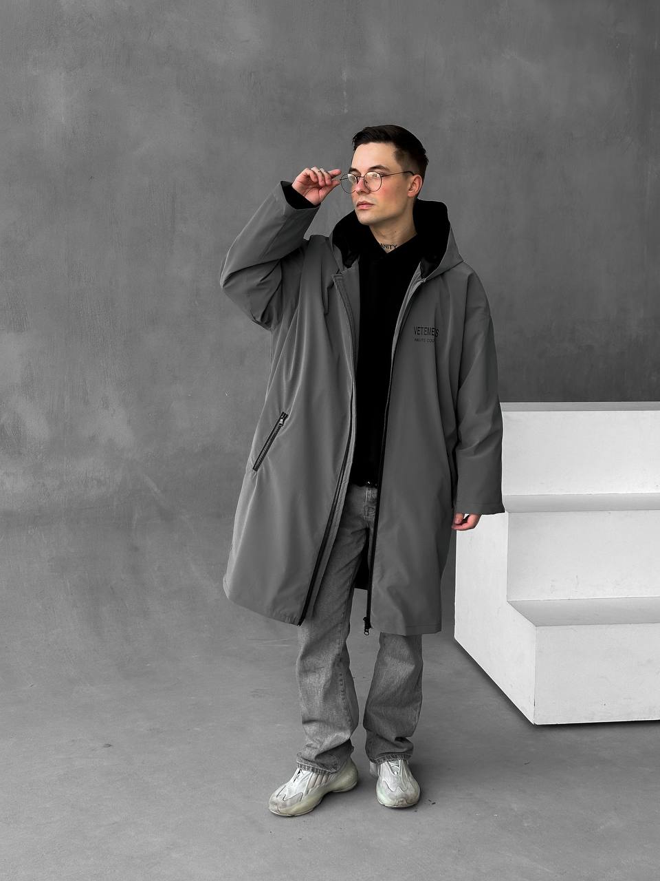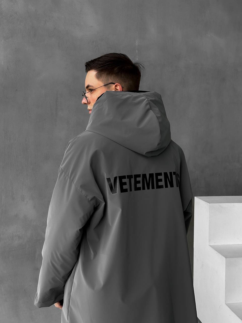 Чоловіча Подовжена Графітова Вітрівка Оверсайз Дощовик з Капюшоном і Написом на Спині
