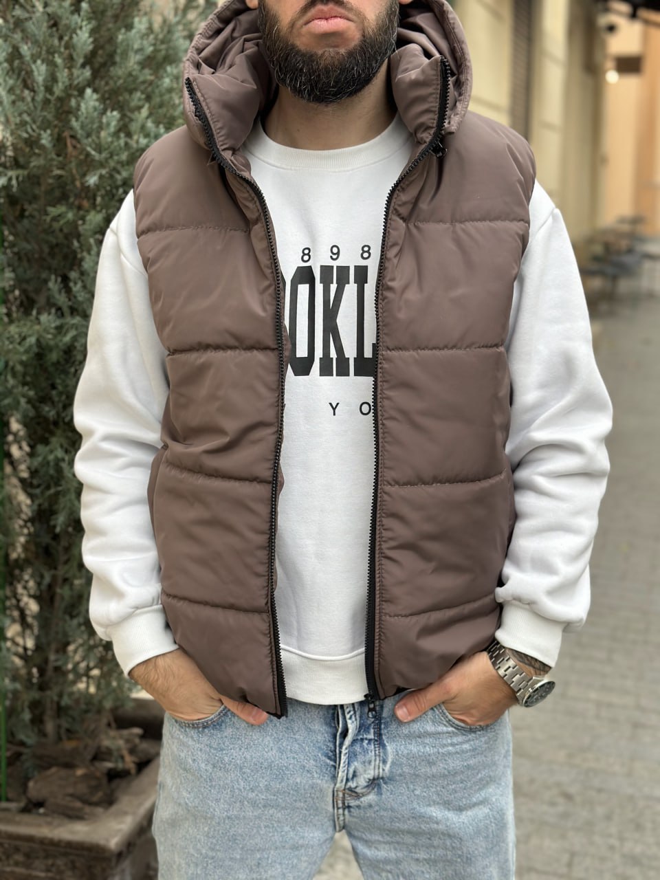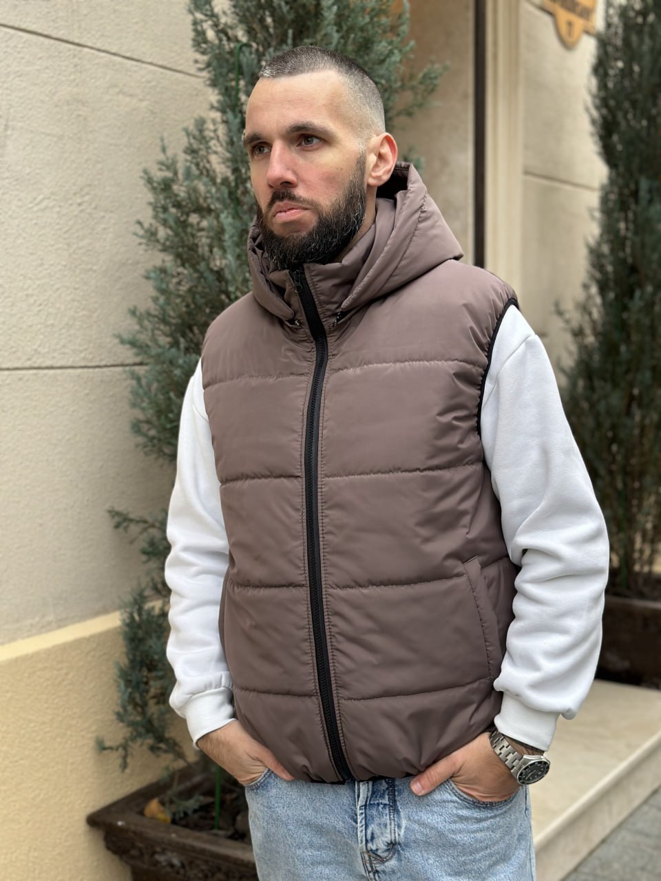 Чоловіча Стьобана Коричнева Жилетка на Блискавці зі Знімним Капюшоном