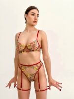 Жіночий комплект Червоної мереживної нижньої білизни з сіточки з квітковою вишивкою.