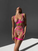 Жіночий Комплект Рожевої Нижньої Білизна Прозорий з Білою Сіточкою – Бюстгальтер + Трусики Стрінги + Пояс + Гартери