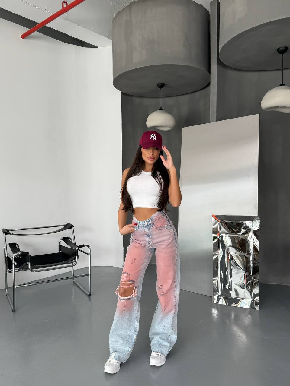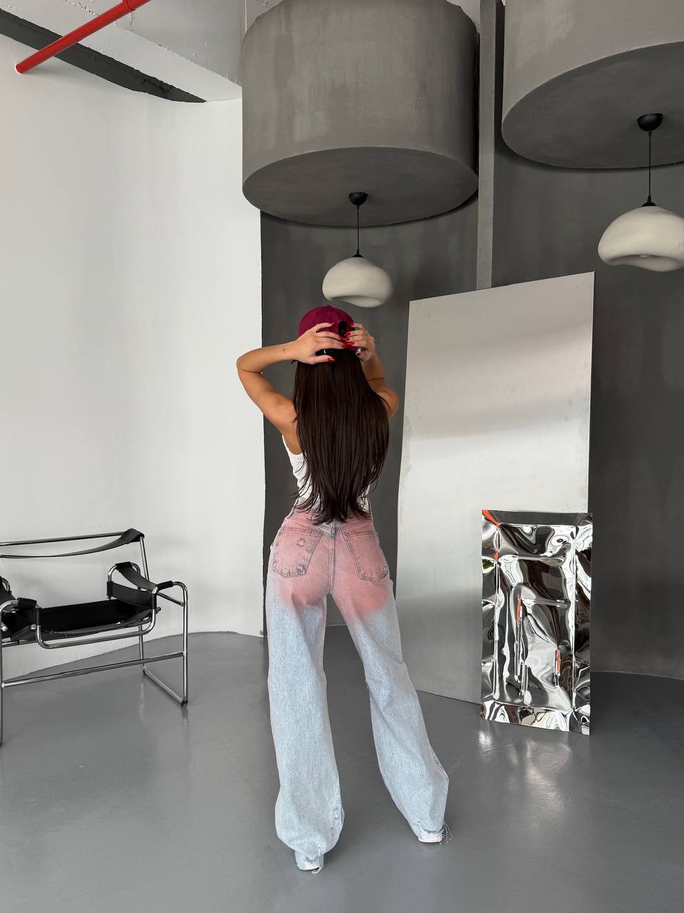 Жіночі Блакитні Рвані Джинси Труби з Червоним Напиленням