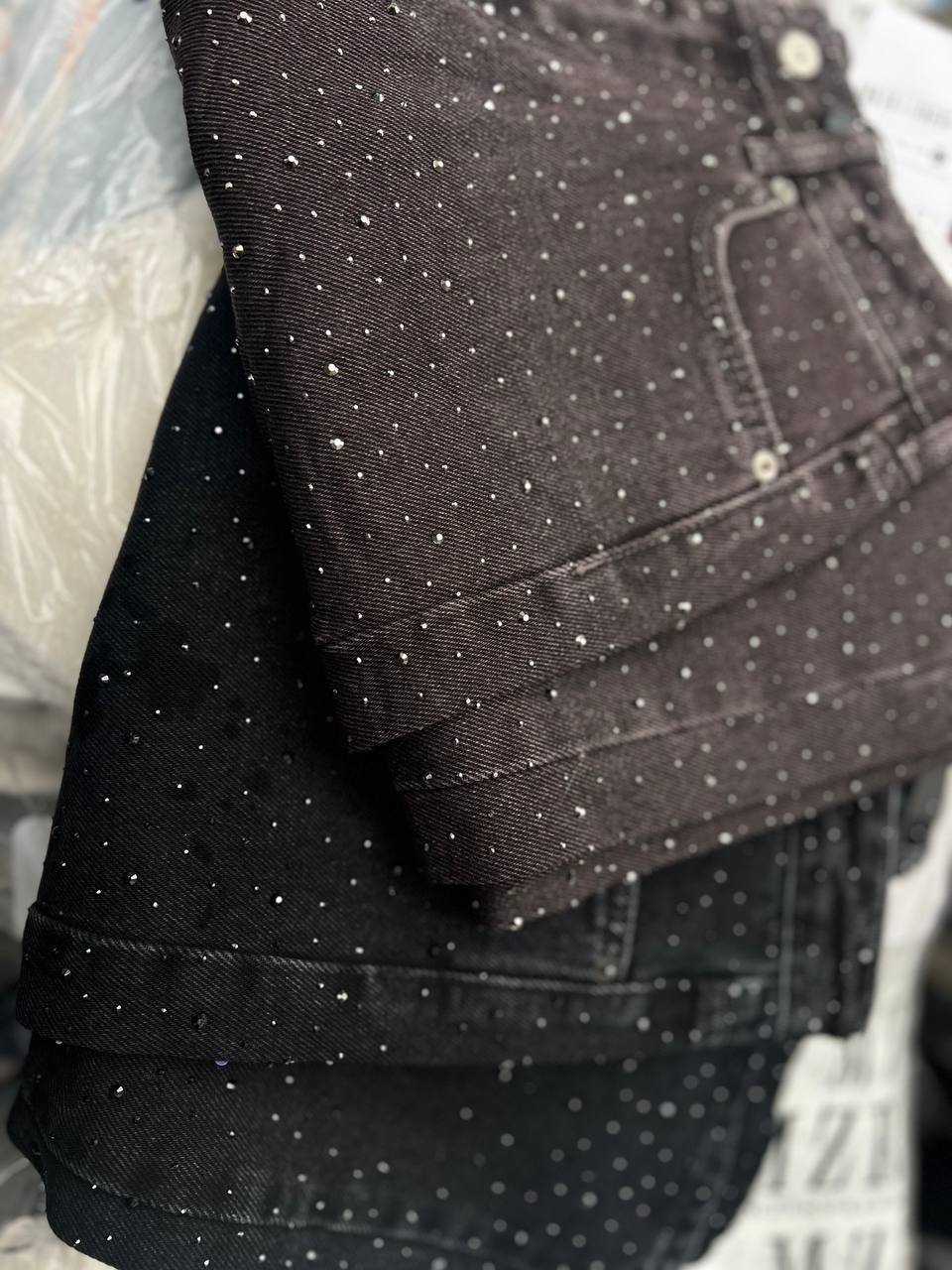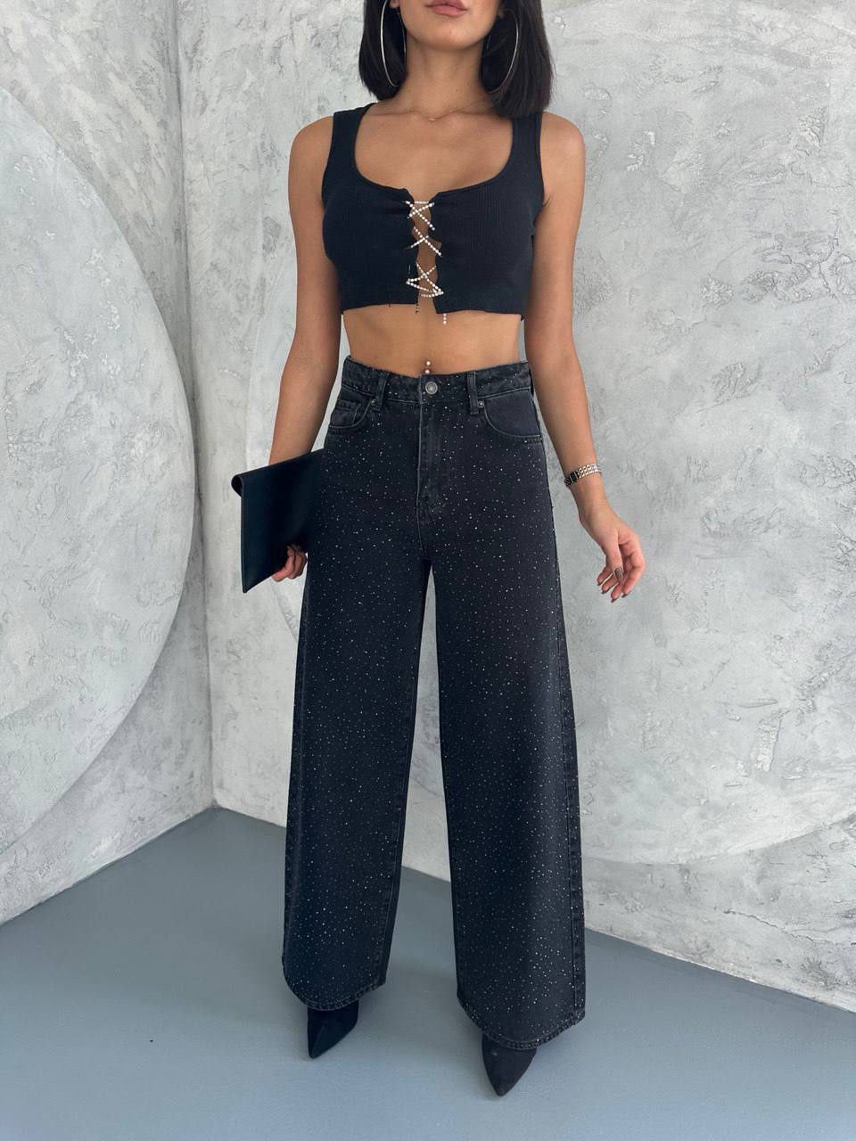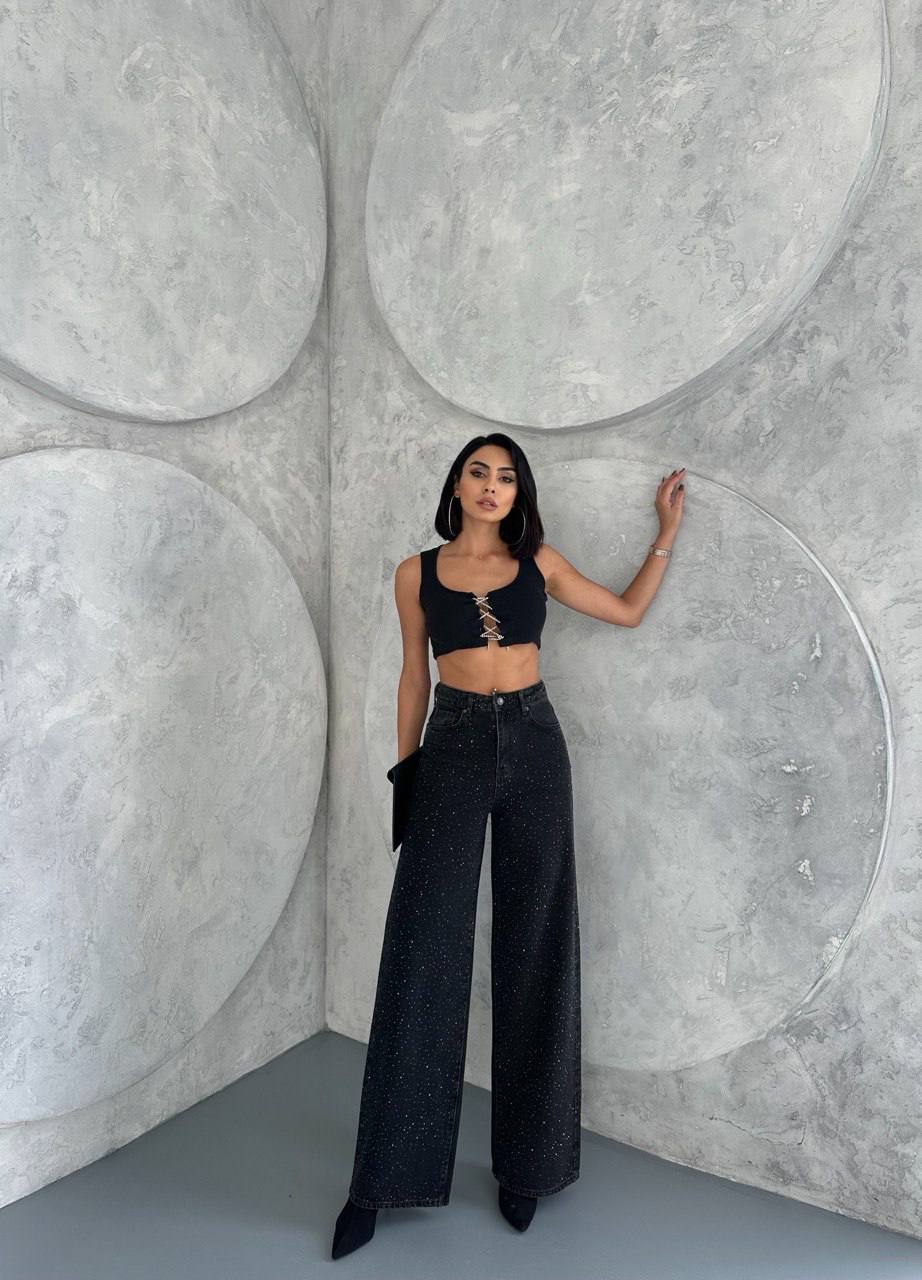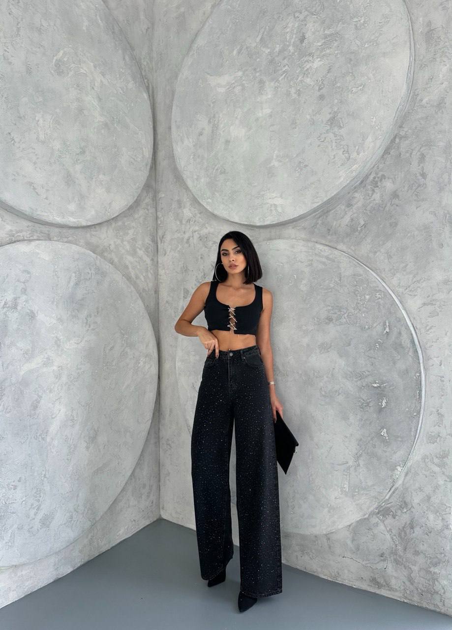 Жіночі Широкі Чорні Джинси Баггі з Камінням Стразами