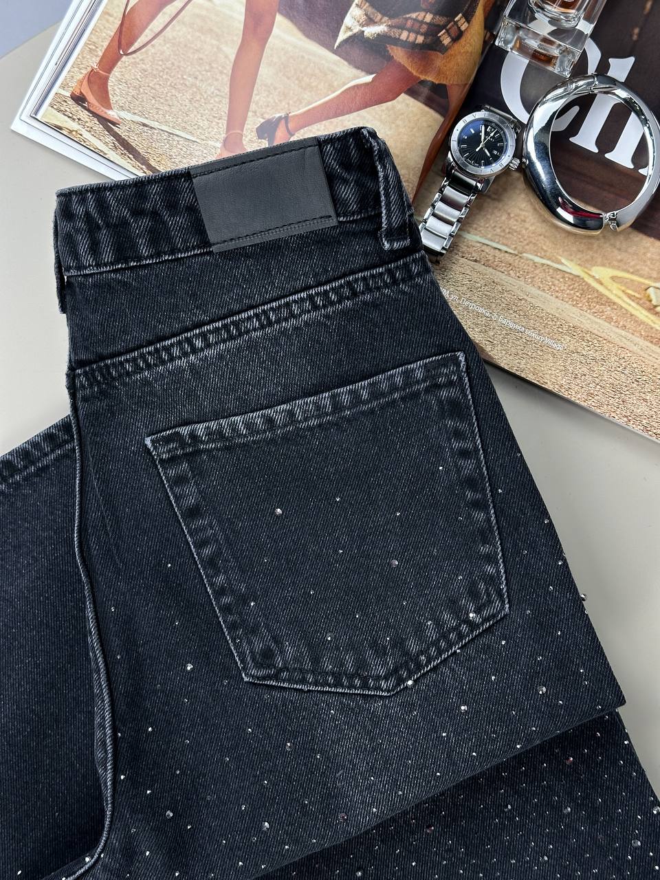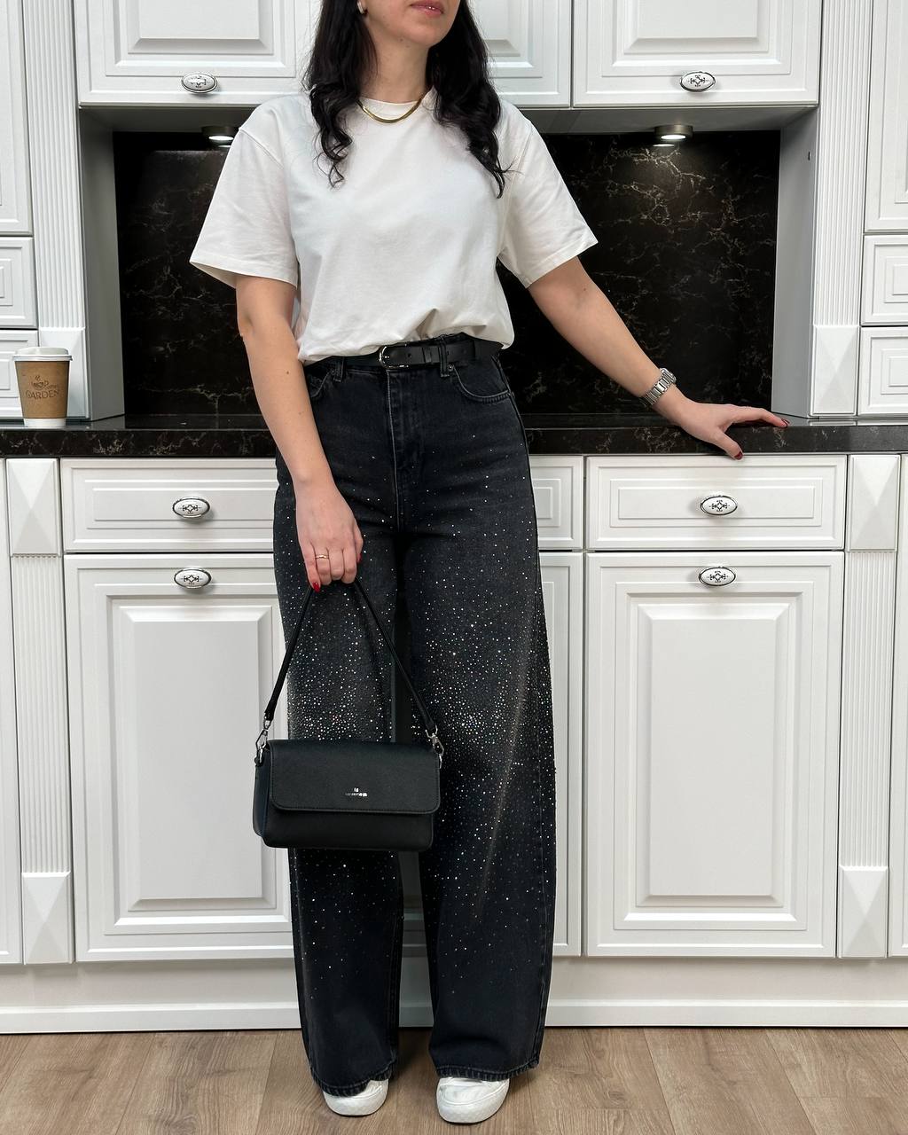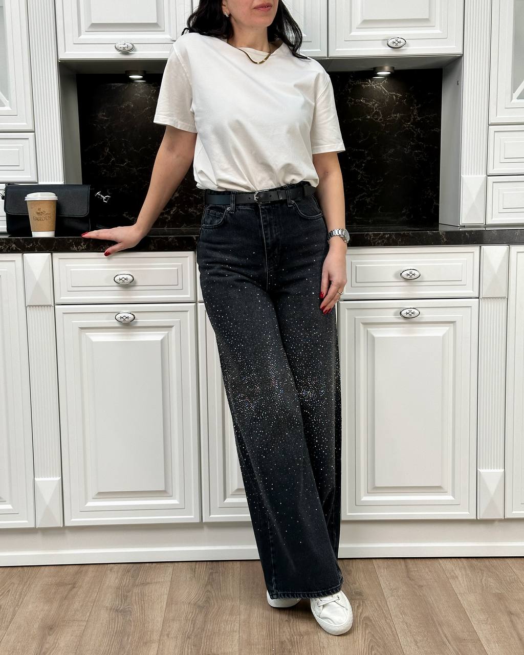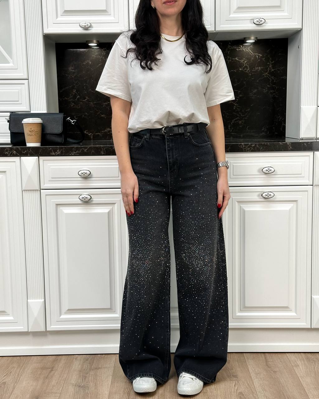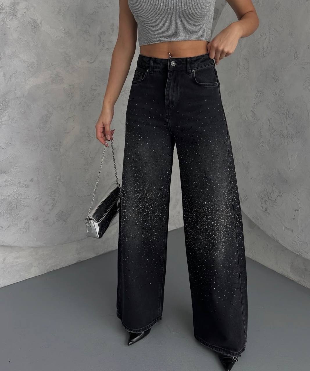 Жіночі Широкі Чорні Джинси Палаццо Баггі з Камінням Стразами