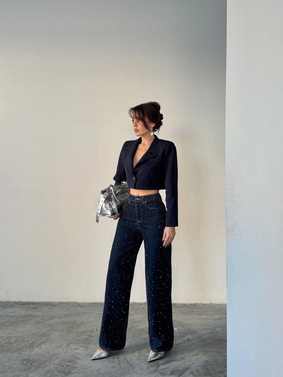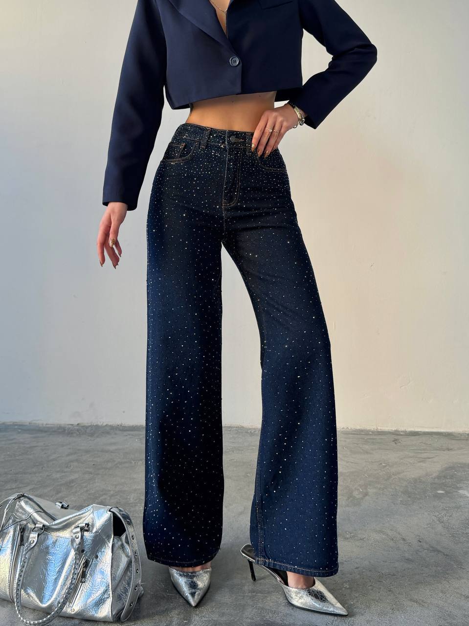 Жіночі Вільні Прямі Темно-Сині Джинси Wide-Leg в Каміннях Стразах