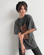 Жіноча Графітова Футболка Оверсайз під Вінтаж з Леопардовим Принтом Вставкою