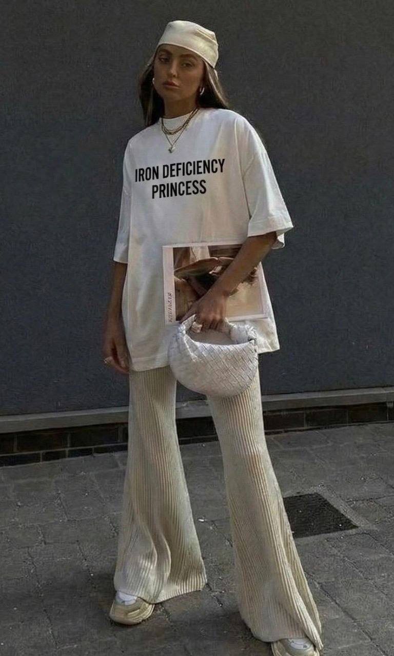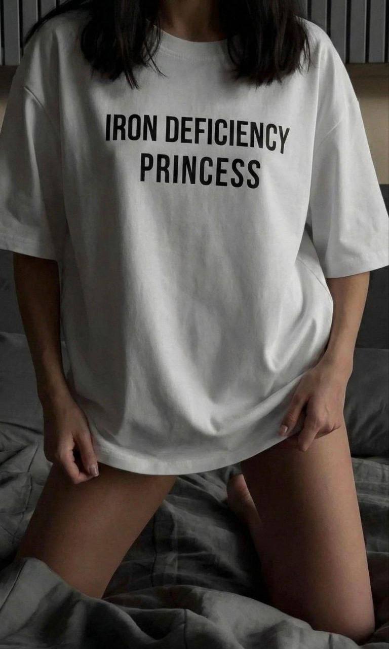 Жіноча Об’ємна Біла Футболка Оверсайз з Написом “Iron Deficiency Princess”