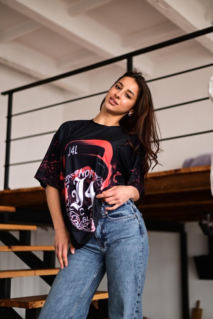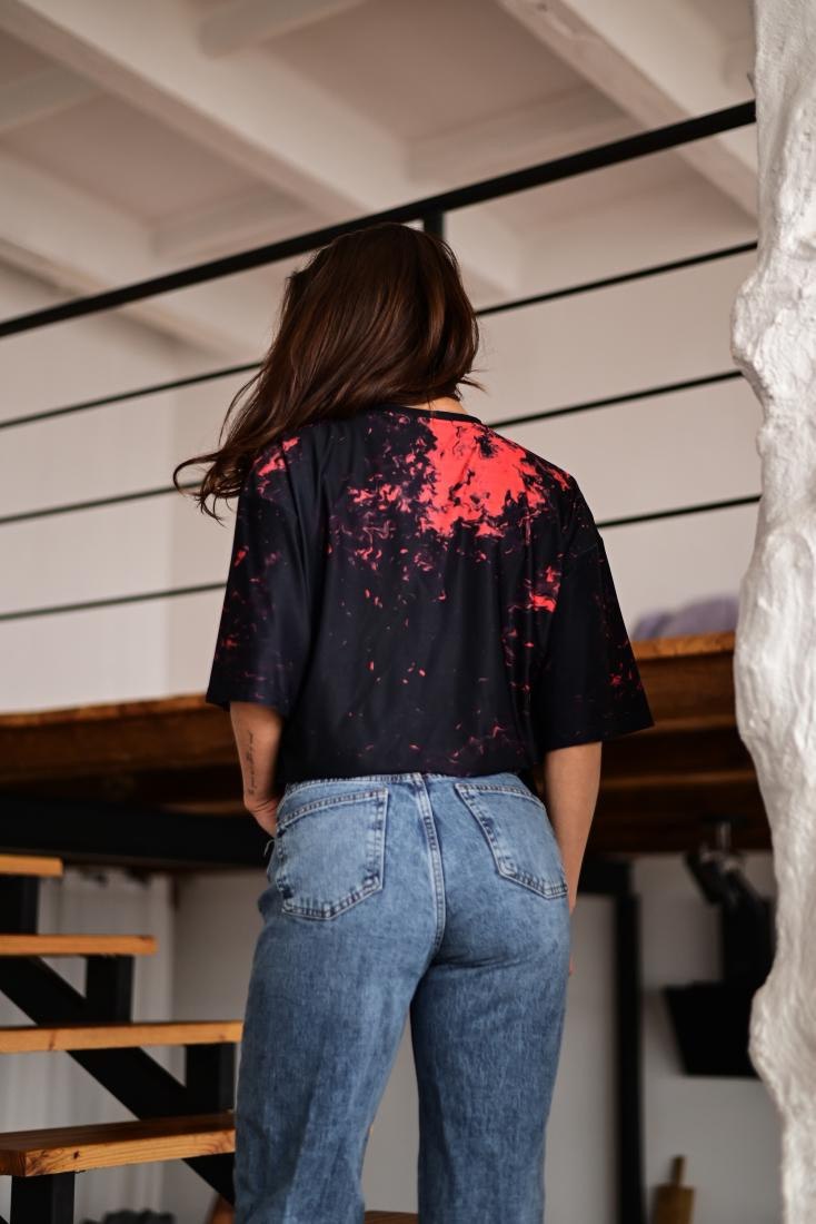 Жіноча Об’ємна Чорна Футболка Оверсайз в Принт “Blood”