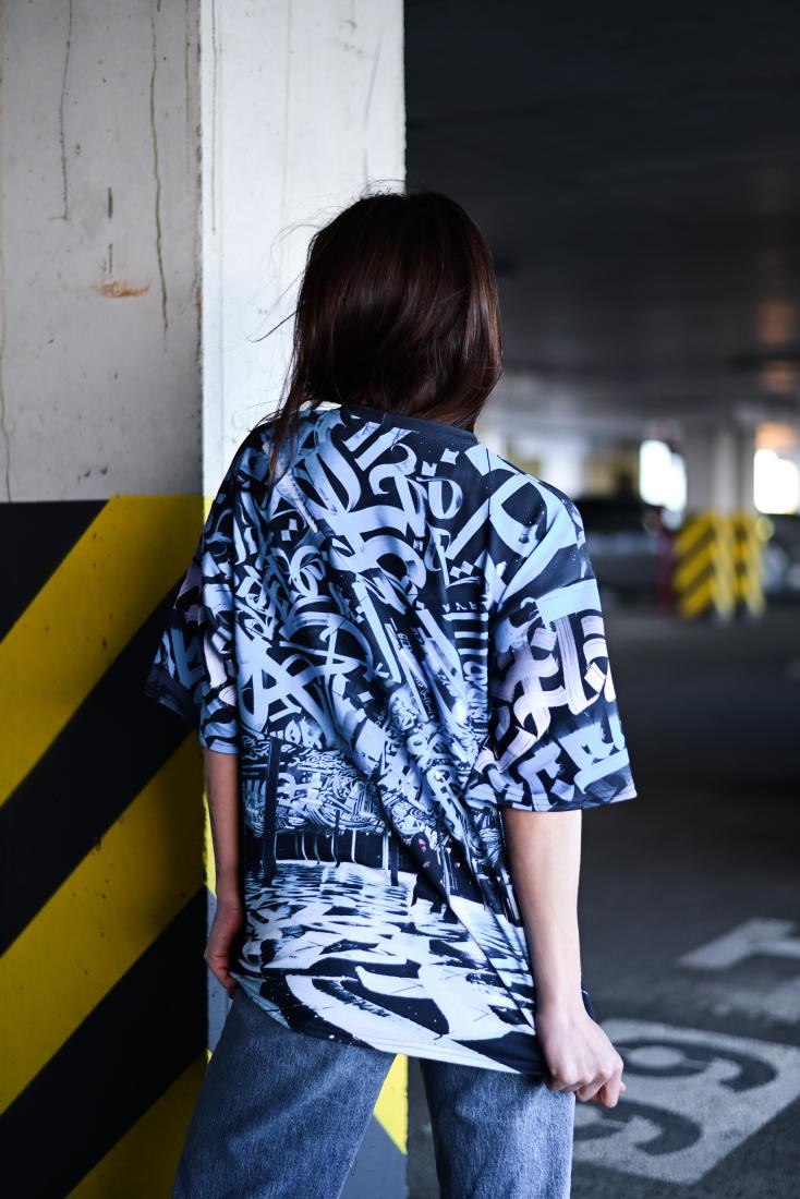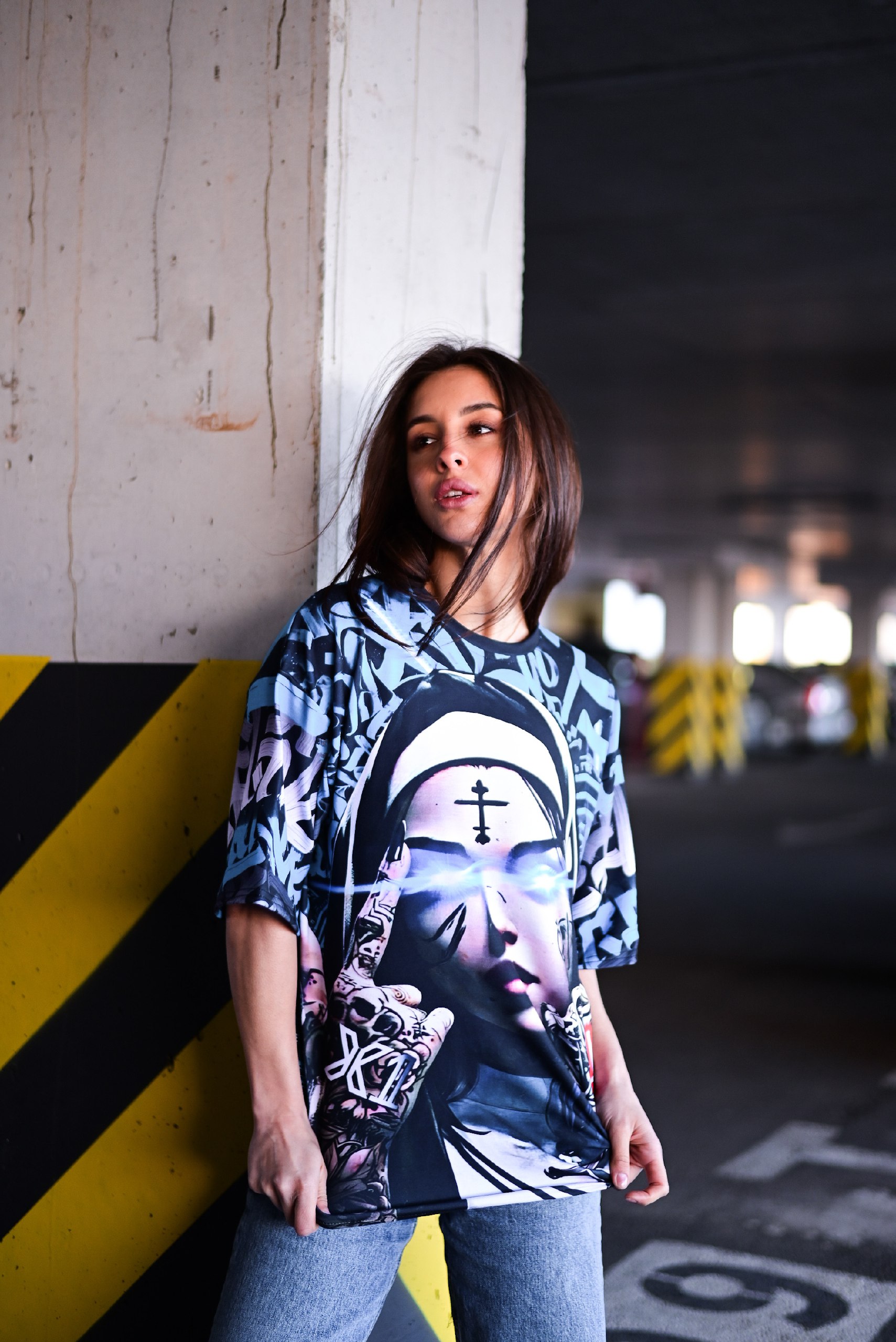 Жіноча Об’ємна Чорно-Біла Футболка Оверсайз з Принтом Монашка