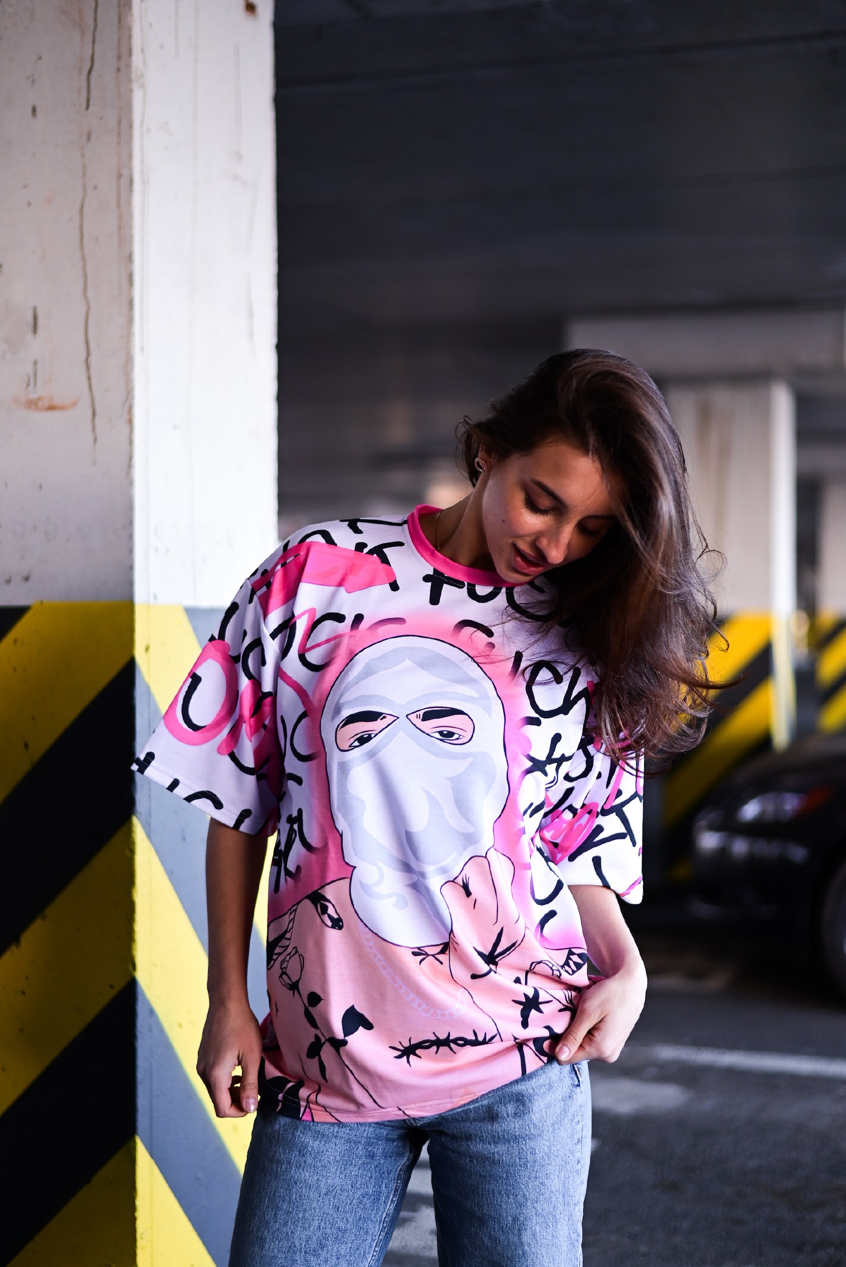 Жіноча Об’ємна Рожева Футболка Оверсайз з Принтом Балаклава
