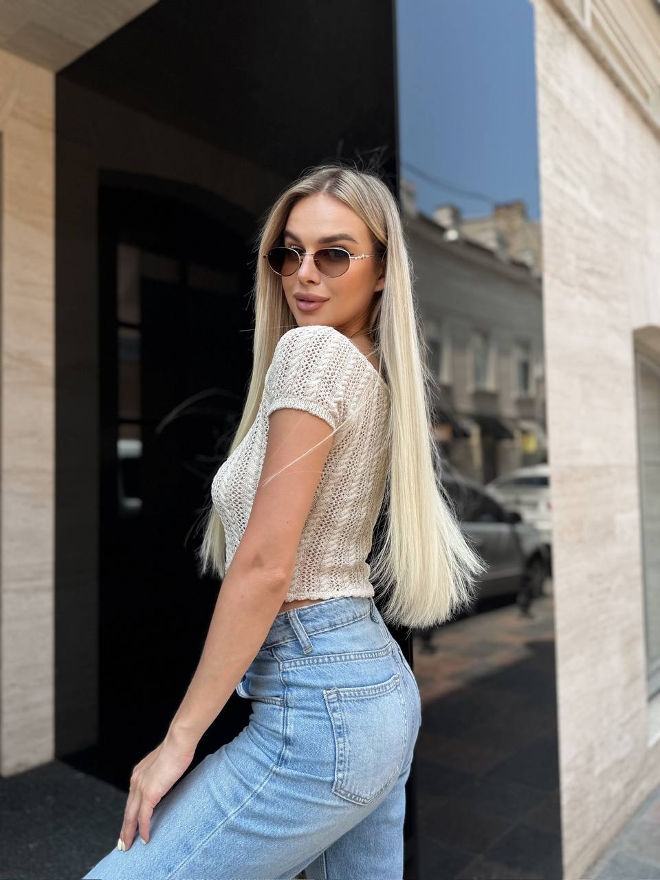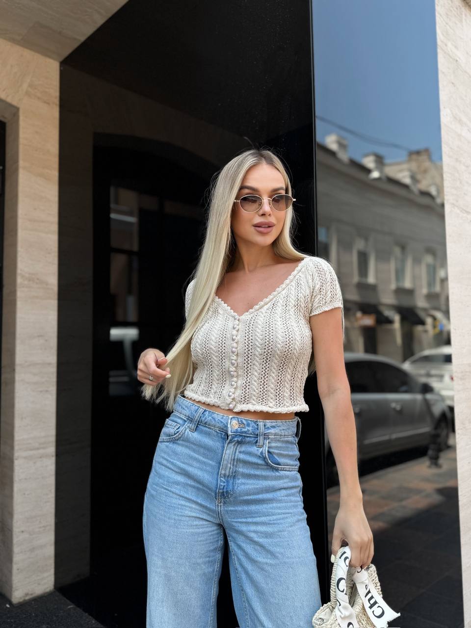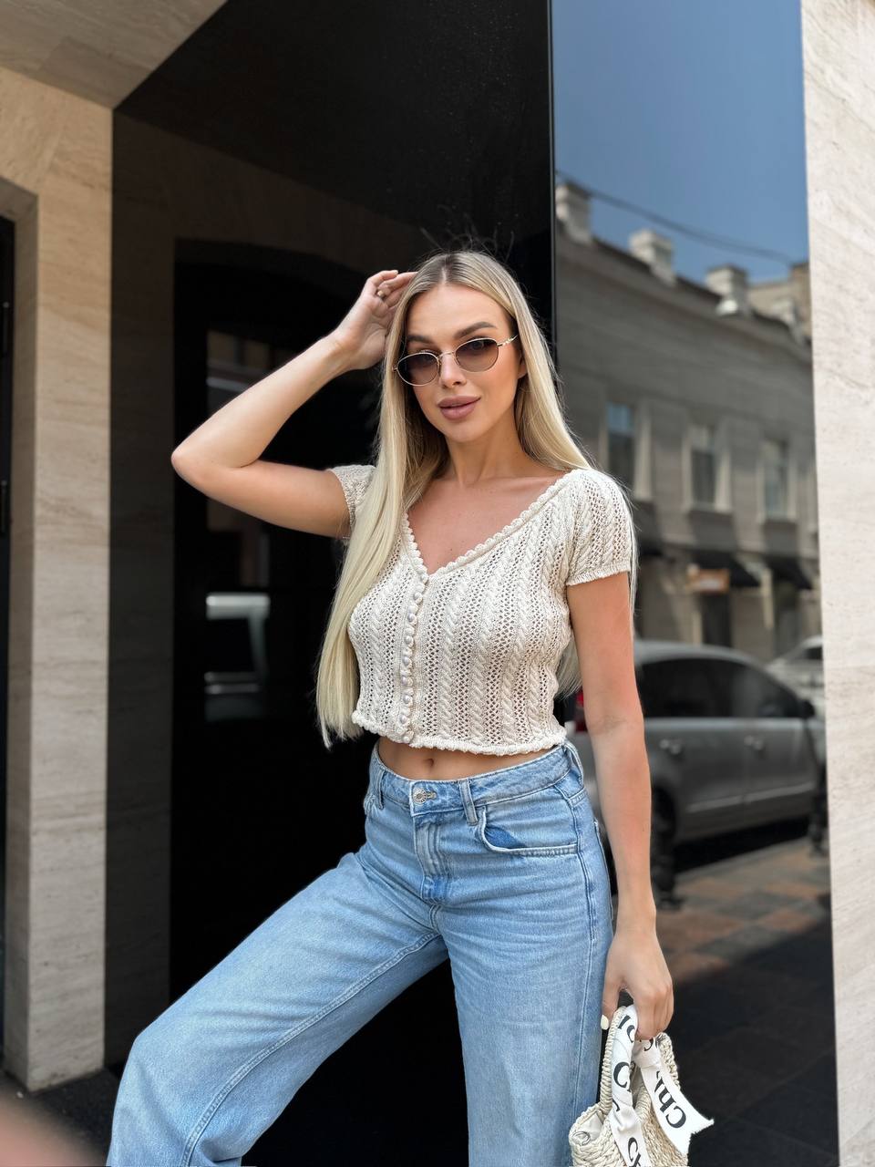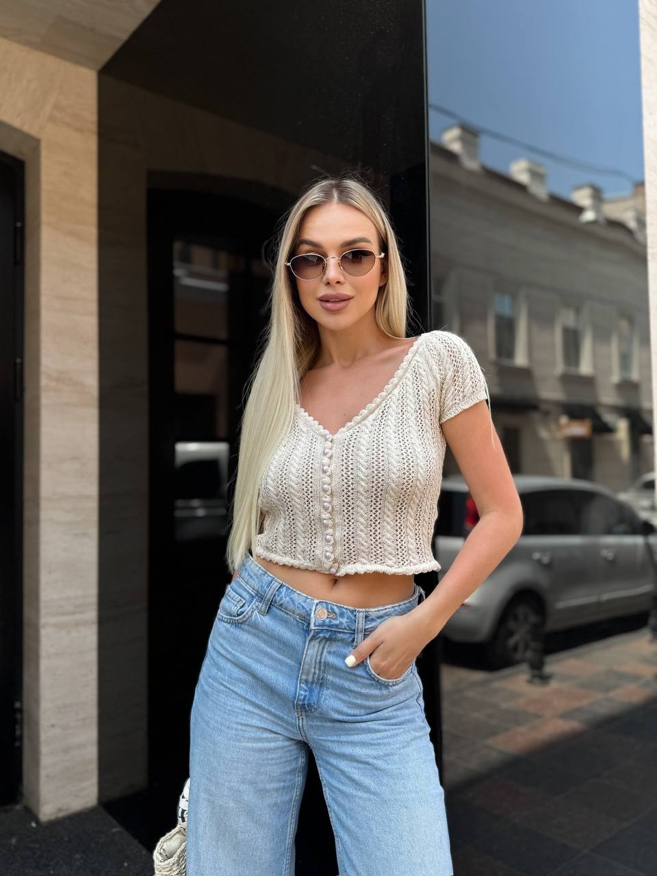 Жіноча В’язана Ажурна Бежева Футболка – Вкорочена на Ґудзиках з V-подібним Вирізом