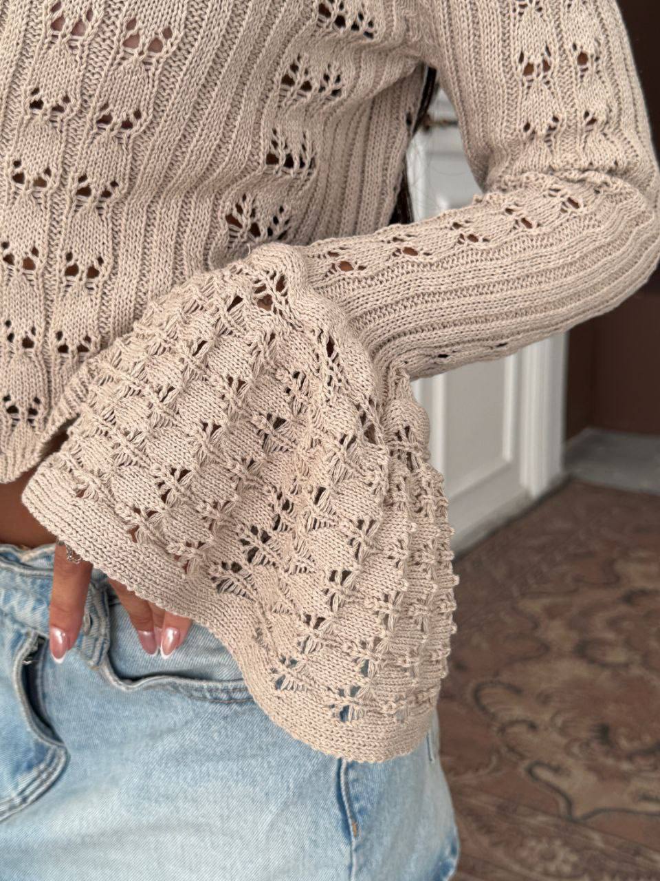 Жіночий Ажурний Бежевий Кардиган на Ґудзиках з Рукавами Кльош