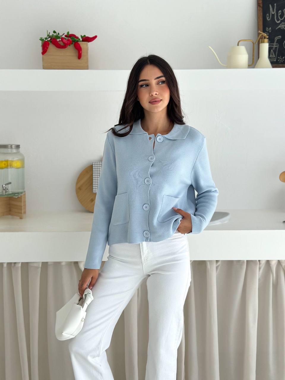 Жіночий Блакитний Кардиган з Коміром та Кишенями – Базовий Класичний у Стилі Old Money