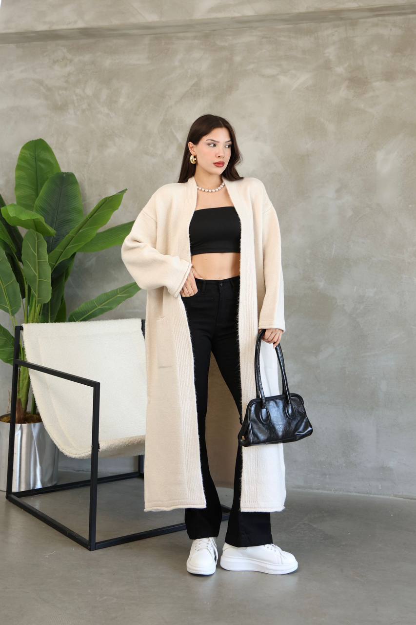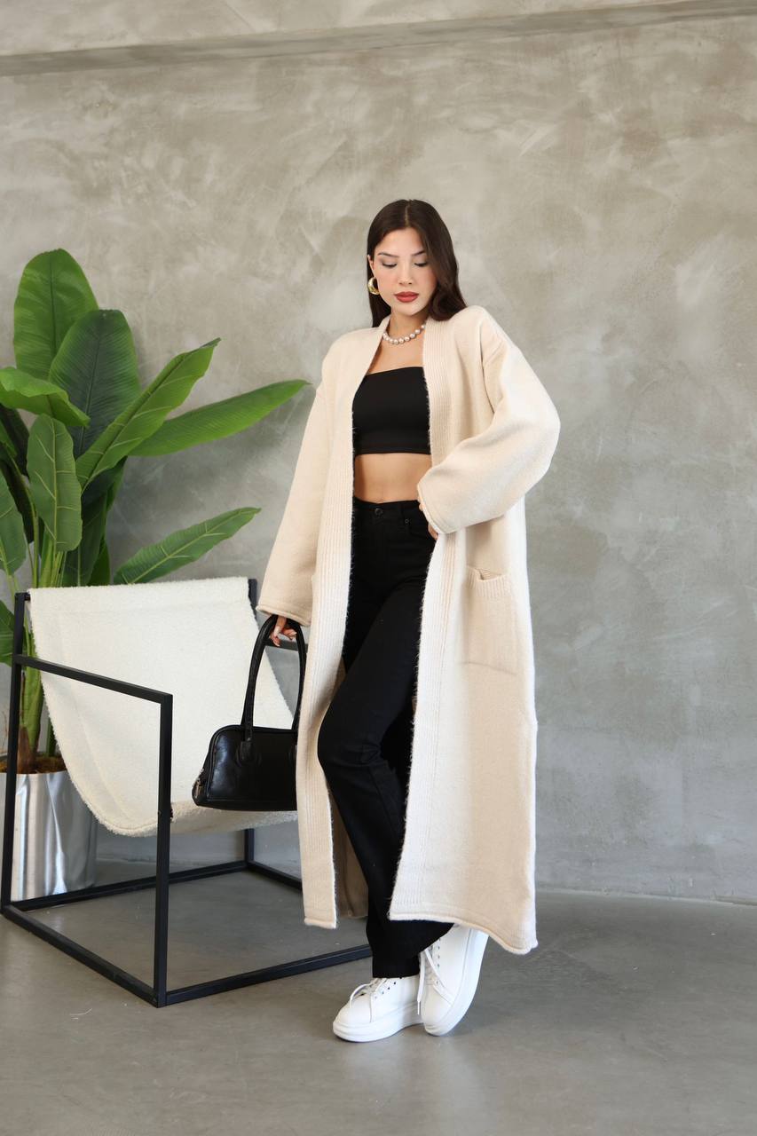 Жіночий Подовжений Бежевий Кардиган Вільного Прямого Крою з Кишенями