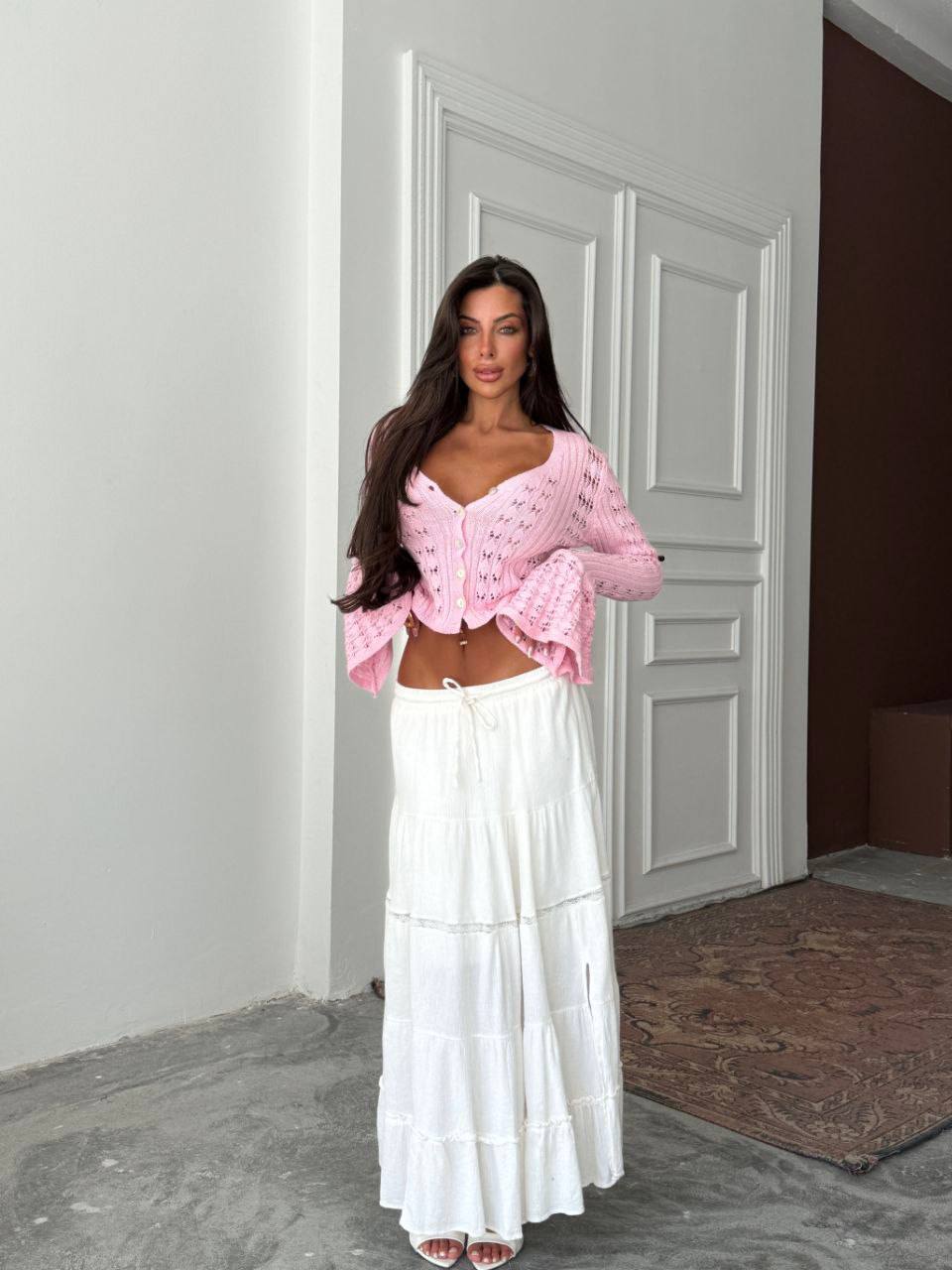 Жіночий Рожевий Кардиган Ажурної В’язки – Кофта на Ґудзиках з Рукавами Кльош