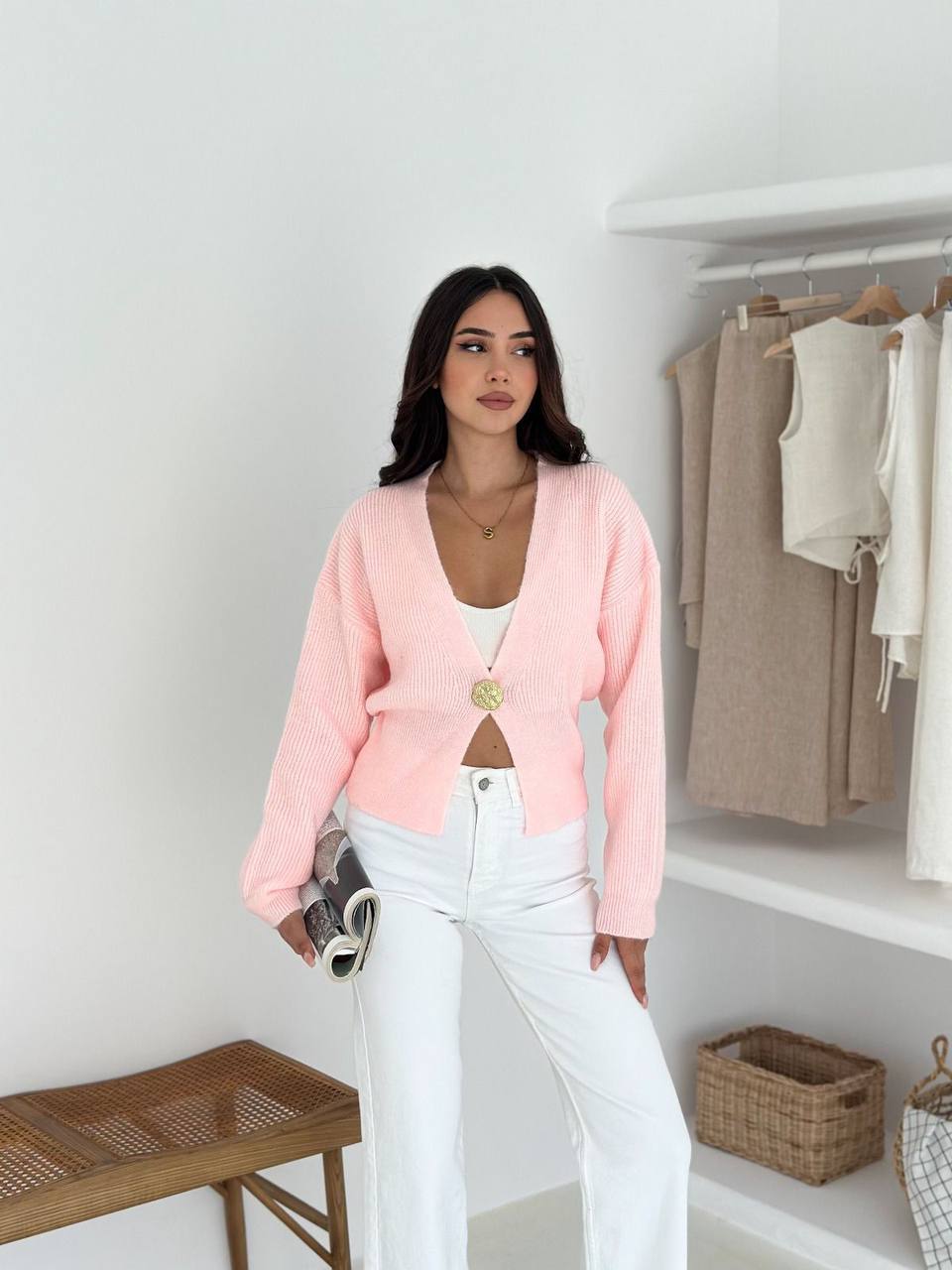 Жіночий Рожевий Кардиган на Одному Ґудзику з V-подібним Вирізом і Заниженою Лінією Плеча
