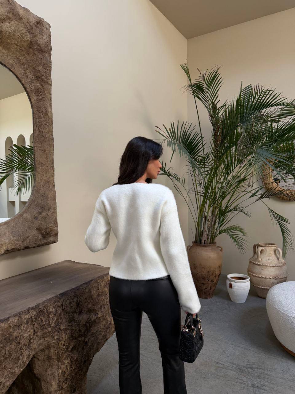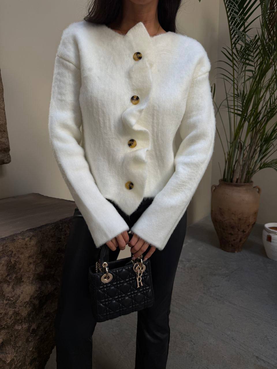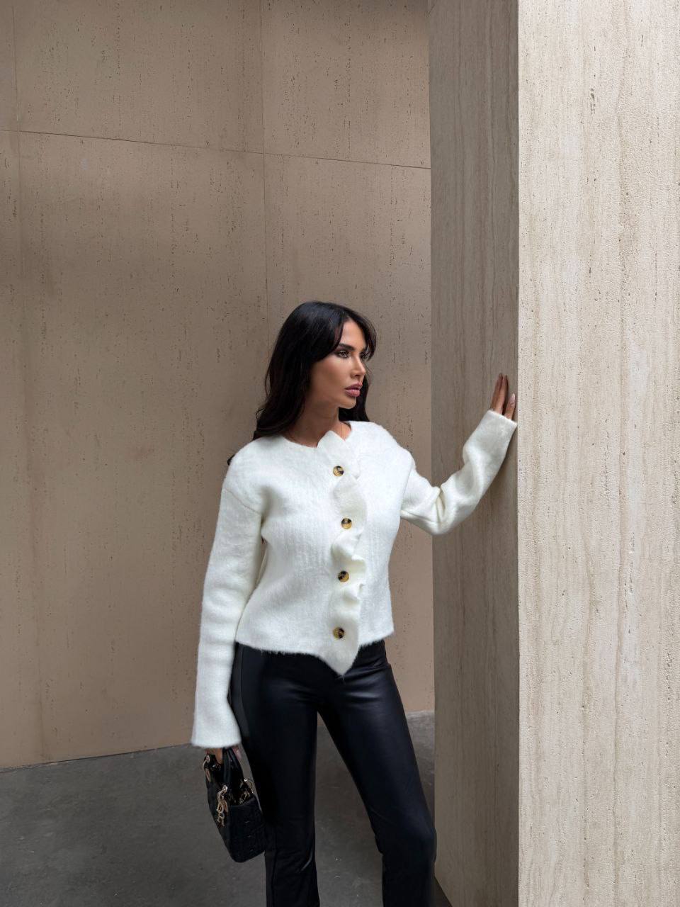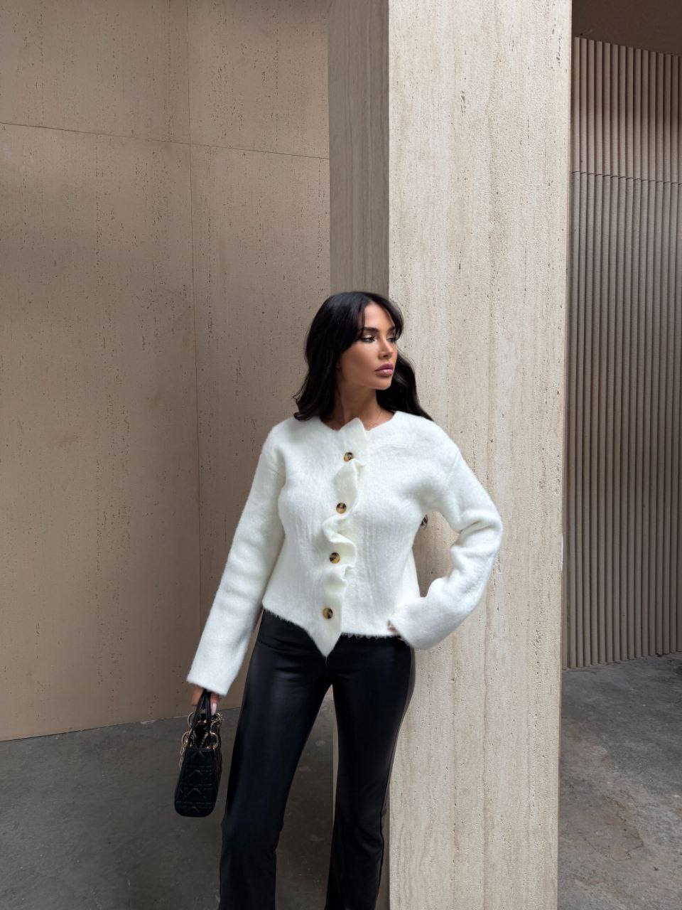 Жіночий Теплий Класичний Білий Кардиган на Ґудзиках з Рюшами