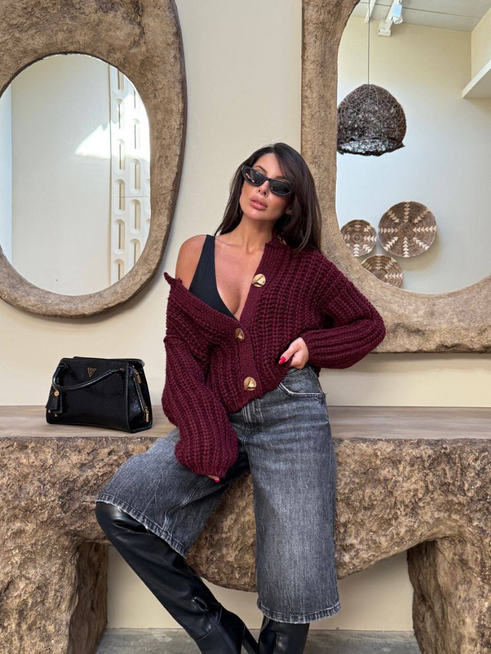Жіночий Укорочений Об’ємний В’язаний Бордовий Кардиган зі Спущеним Плечем