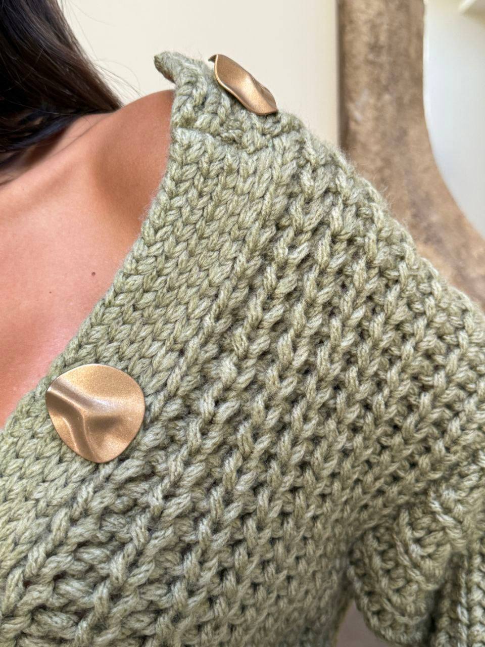 Жіночий Укорочений Об’ємний В’язаний Зелений Кардиган зі Спущеним Плечем