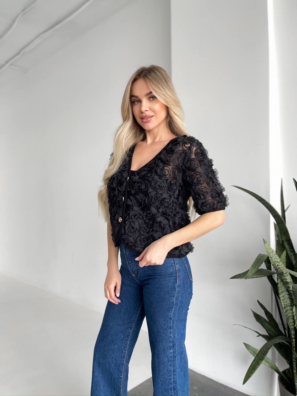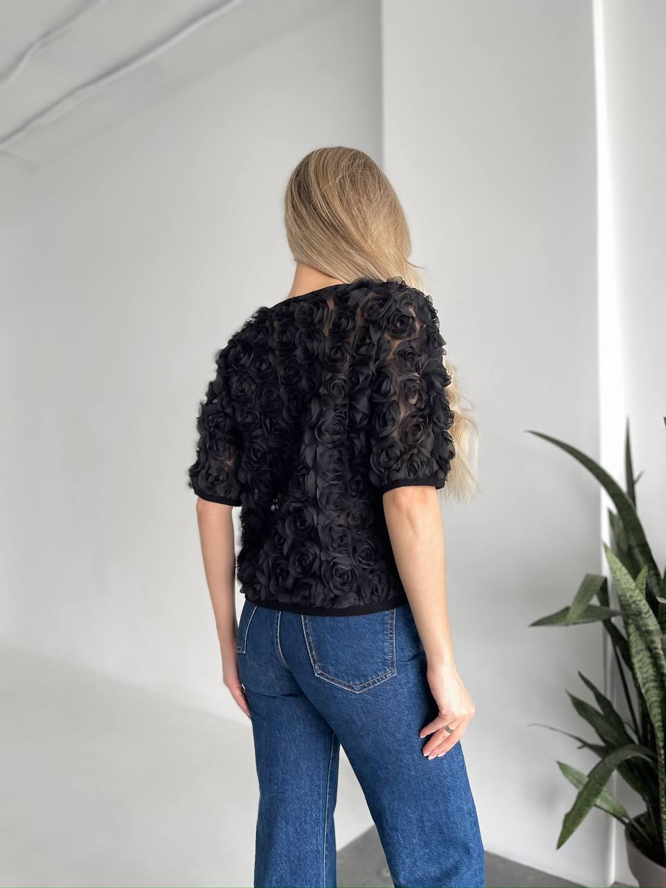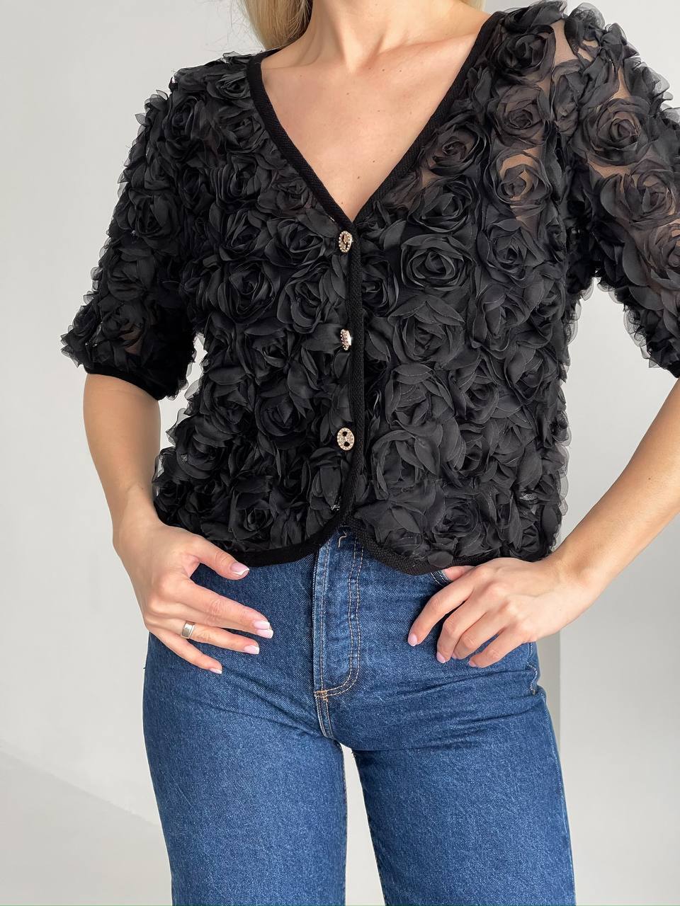 Жіноча Ажурна Чорна Кофта на Ґудзиках з Короткими Рукавами та 3D-квітами